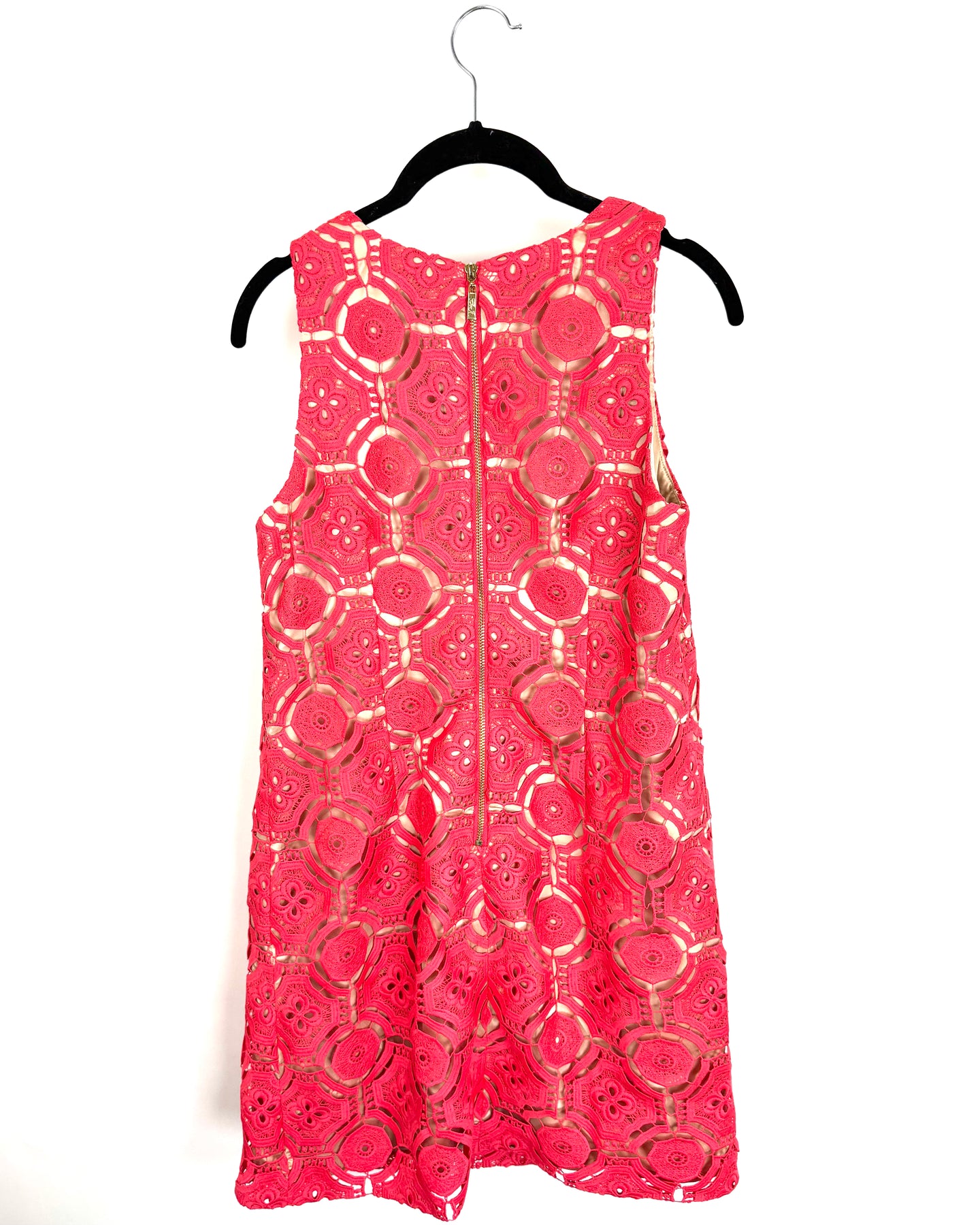 Eliza J nude sleeveless dress pinkish red lace overlay and back gold zipper