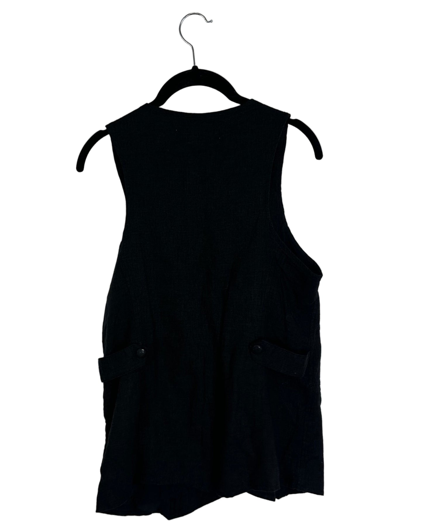 Free People black vest, lightweight material with partial interior lining, scoop neckline, sleeveless style with panel detailing, button up front closure with two stitched pockets