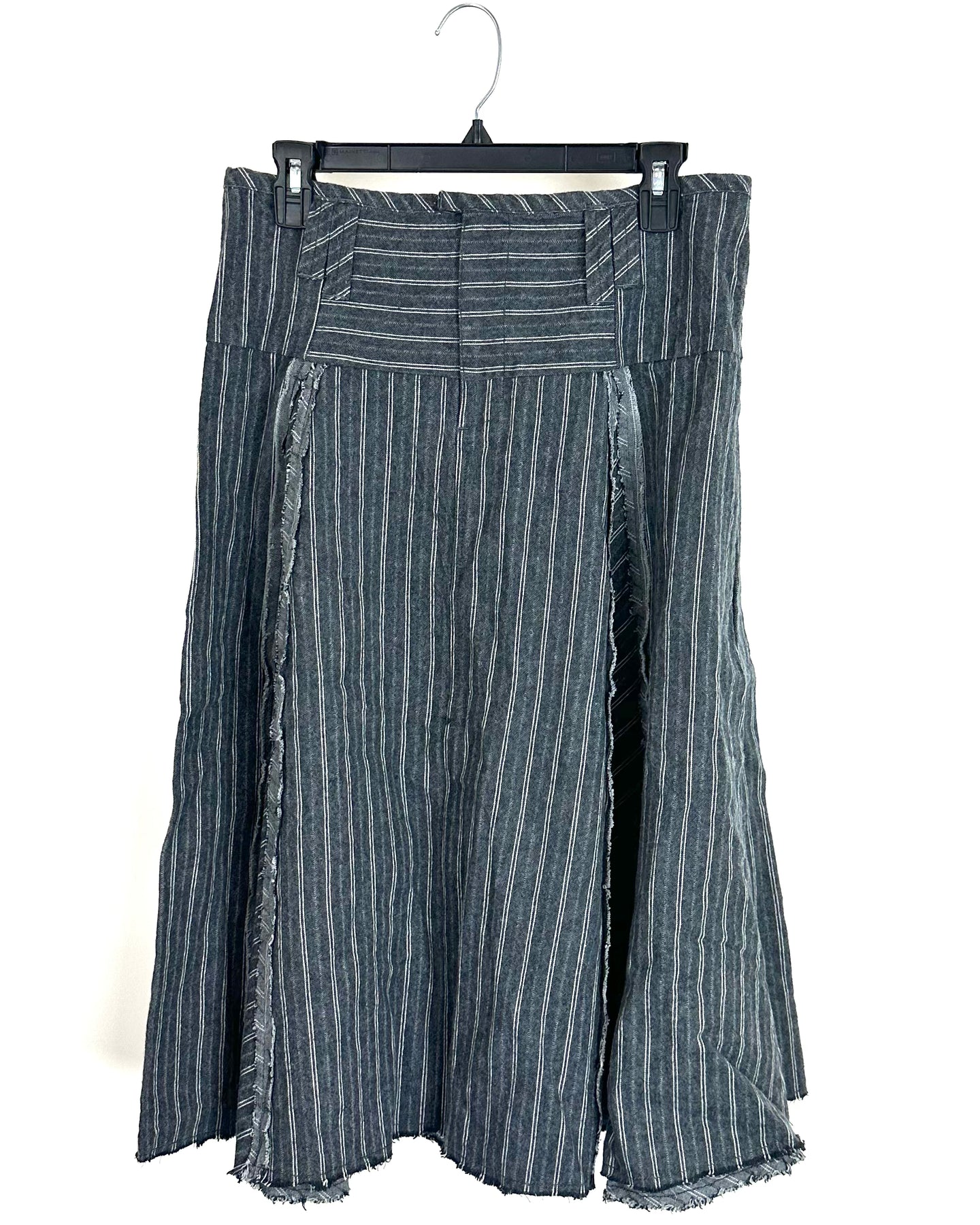 Free People pinstripe gray and white flowy skirt with large belt loops, pleats, distressed trim and front zipper and hook and eye closure