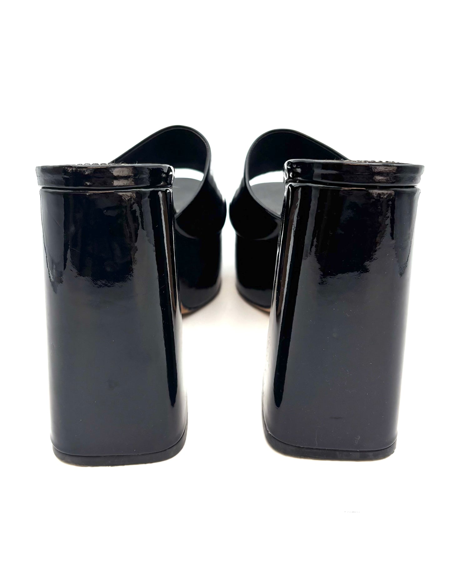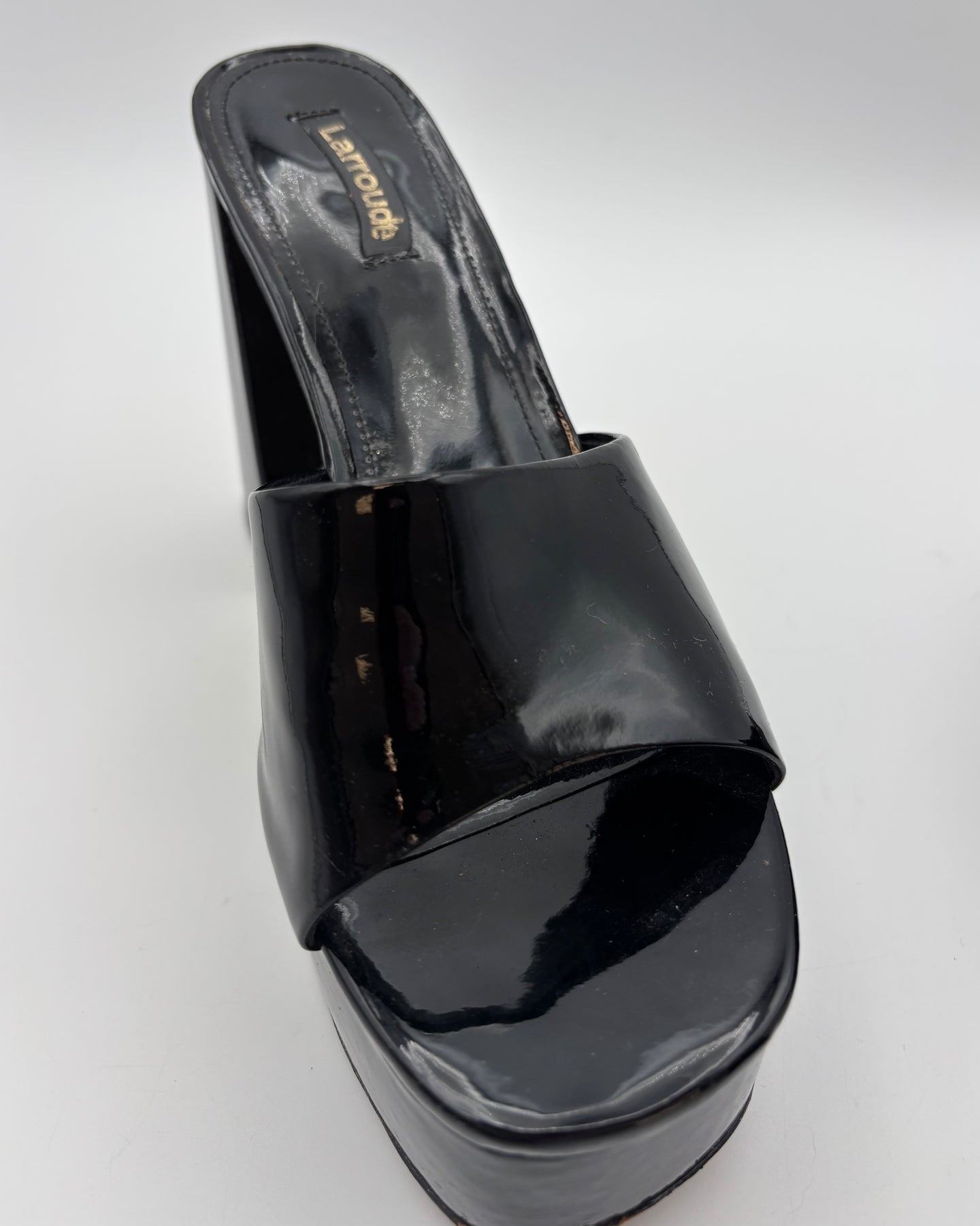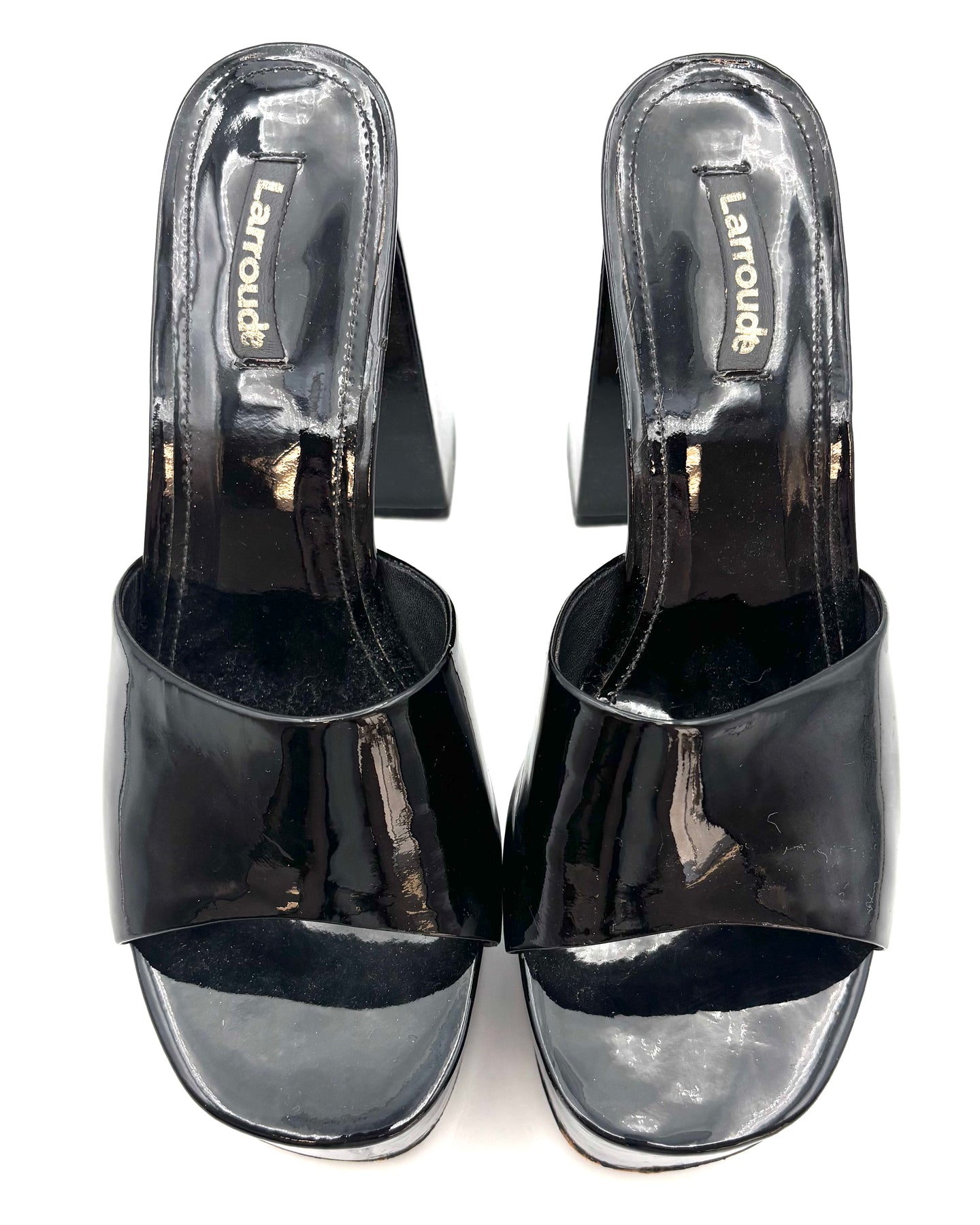 Larroude black patent leather mule with a platform, open round toe and block heel. Please note the bottom of the shoe is scuffed.
