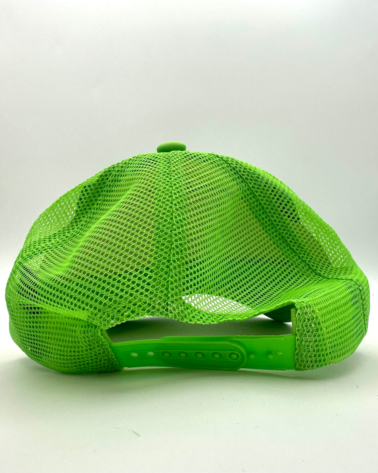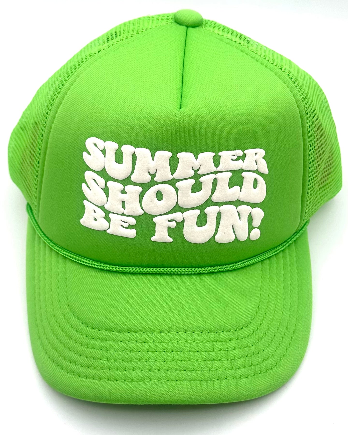 Loverboy bright green trucker hat with a mesh back, adjustable snap back and "Summer Should Be Fun" embroidered in white