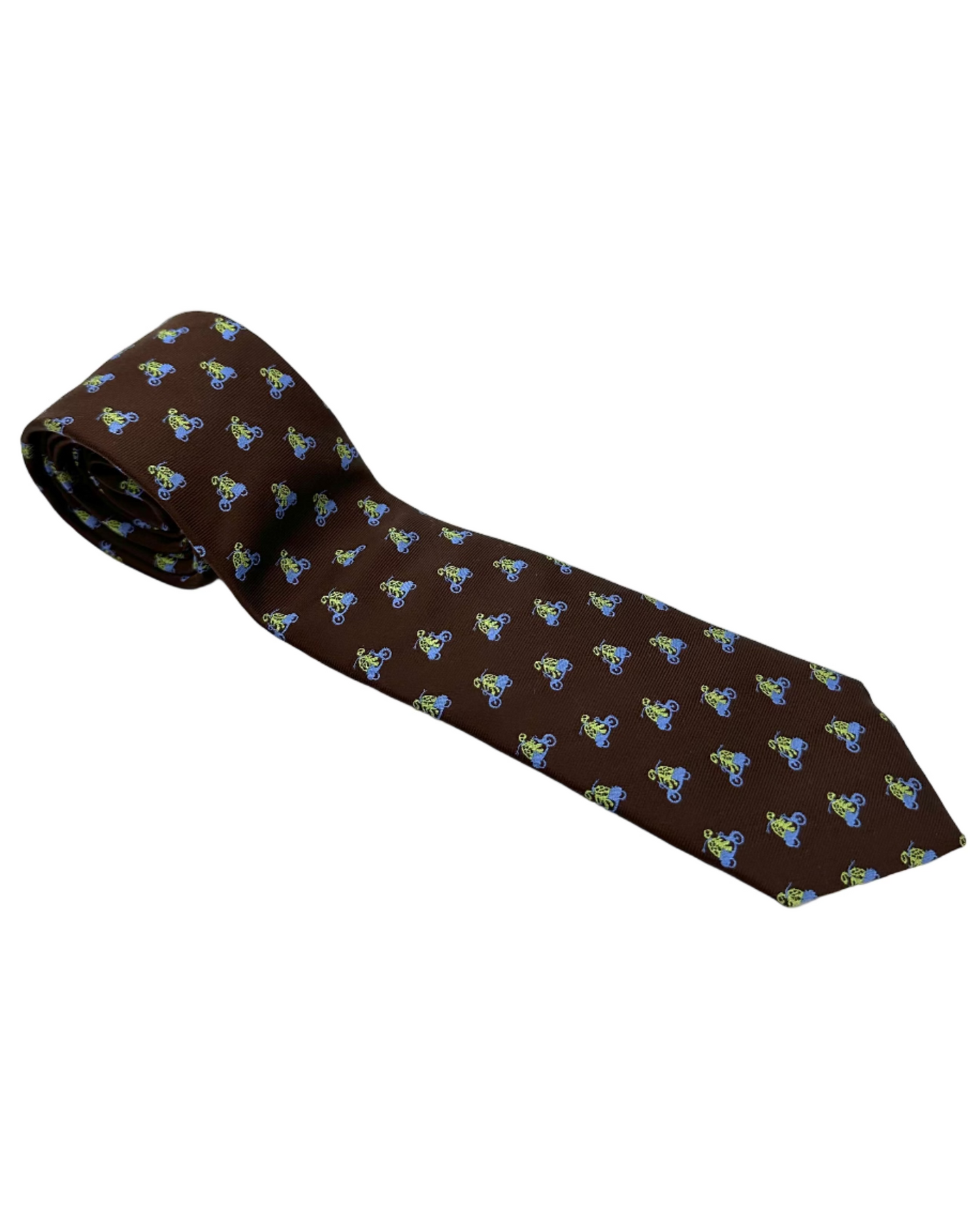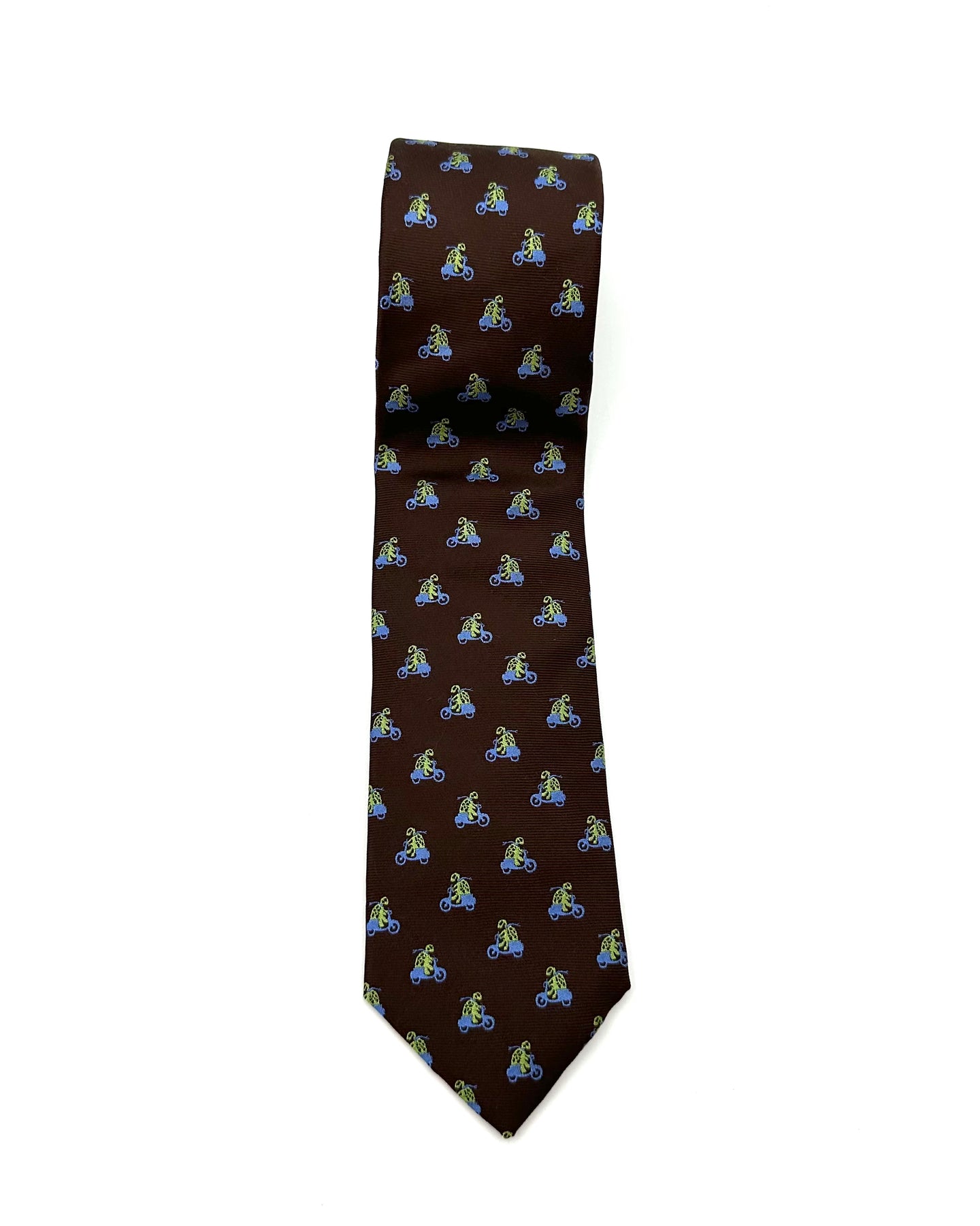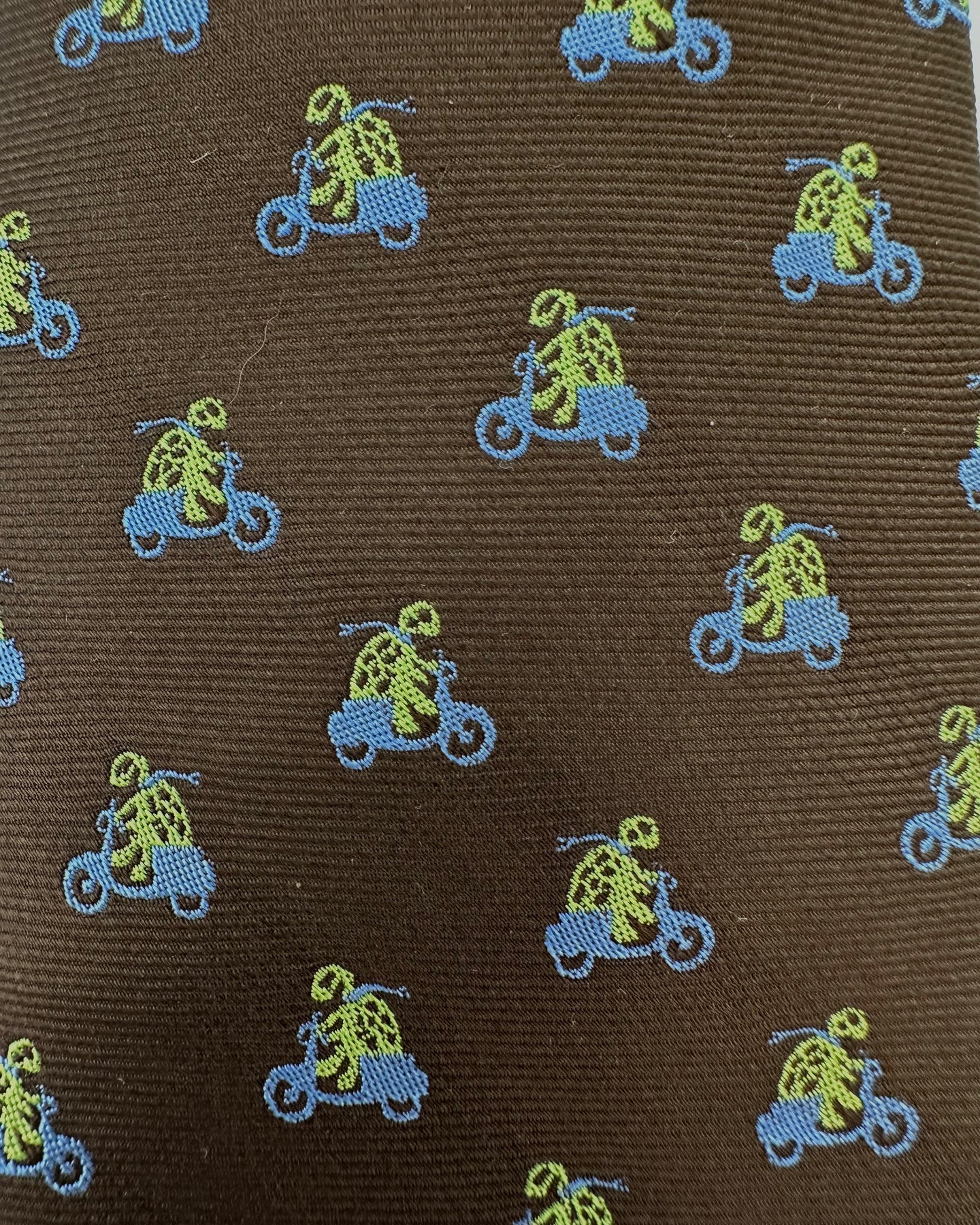 Brown neck tie with abstract green skeleton riding a blue bike