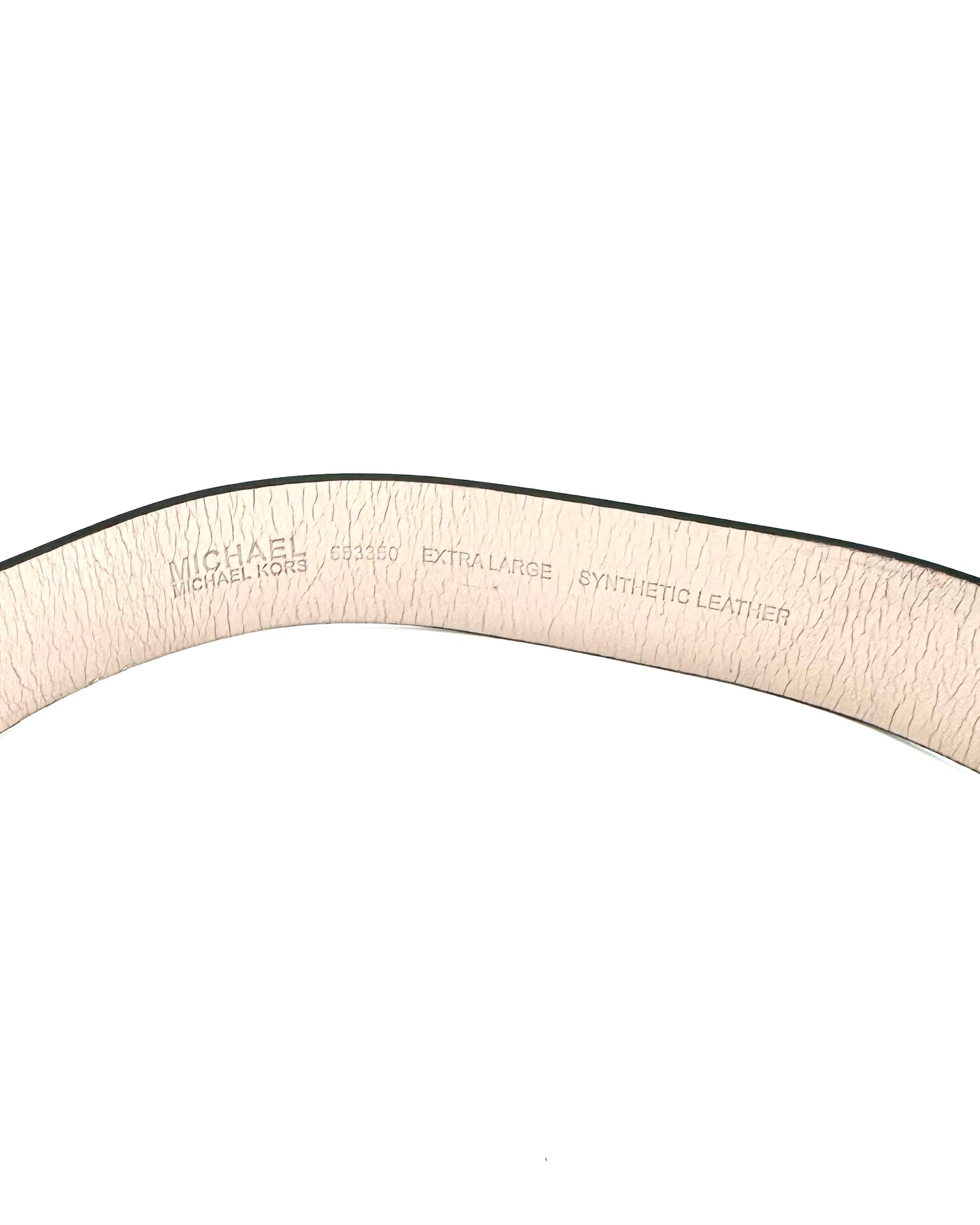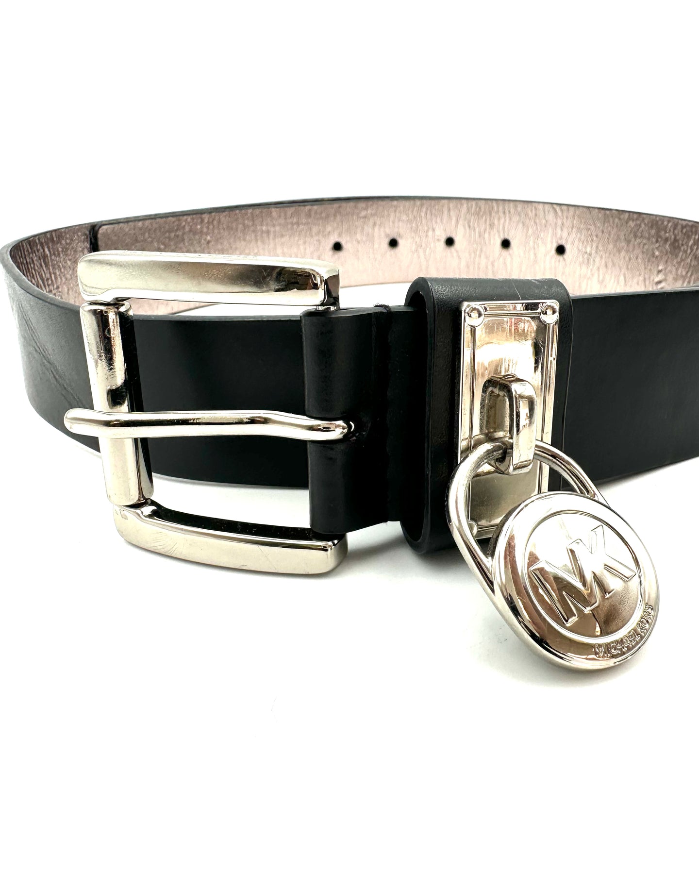 Michael Kors black leather belt with silver belt buckle and lock detail
