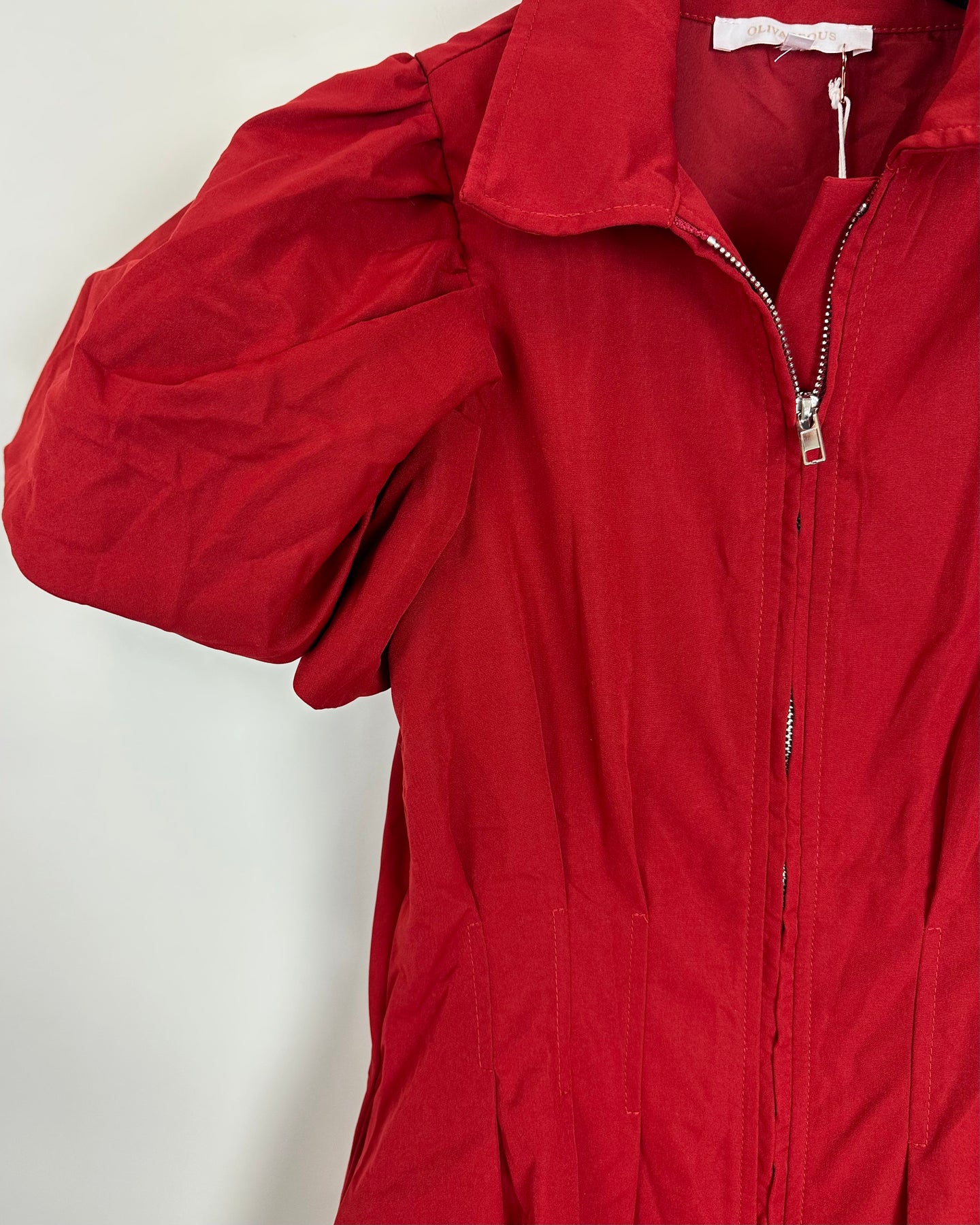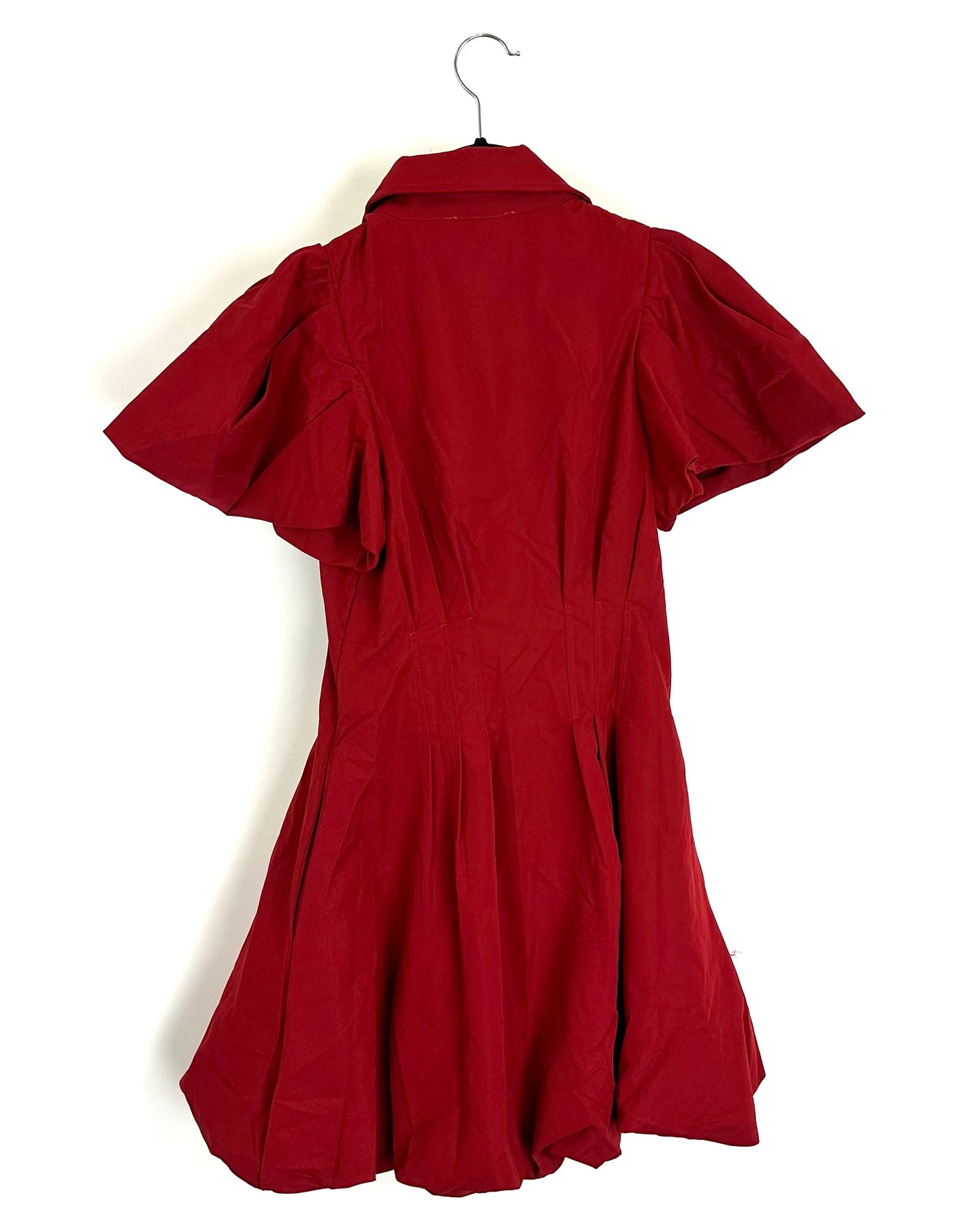 Olivaceous red dress with a collar neckline, a full zipper down the middle, large, pleated short sleeves, pleat details along the waist, and a bubble hem on the skirt
