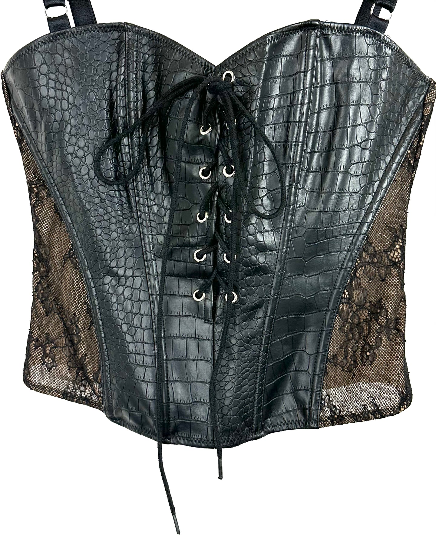 White Fox black faux leather and black lace corset top with back silver zipper, adjustable straps, boning and front tie closure with a sweetheart neckline