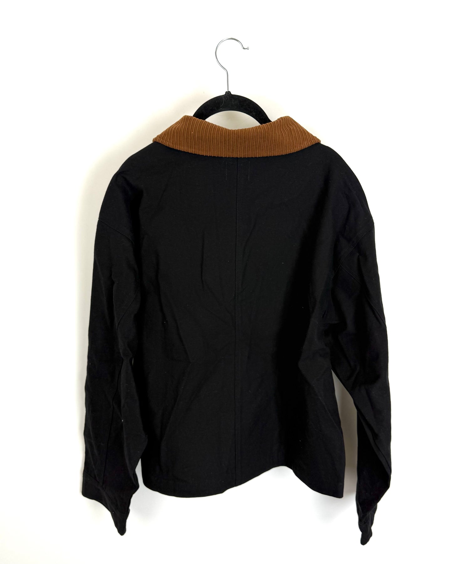 Black lightweight jacket with a brown corduroy collar, a silver zipper, a slightly cropped fit and two large front pockets.