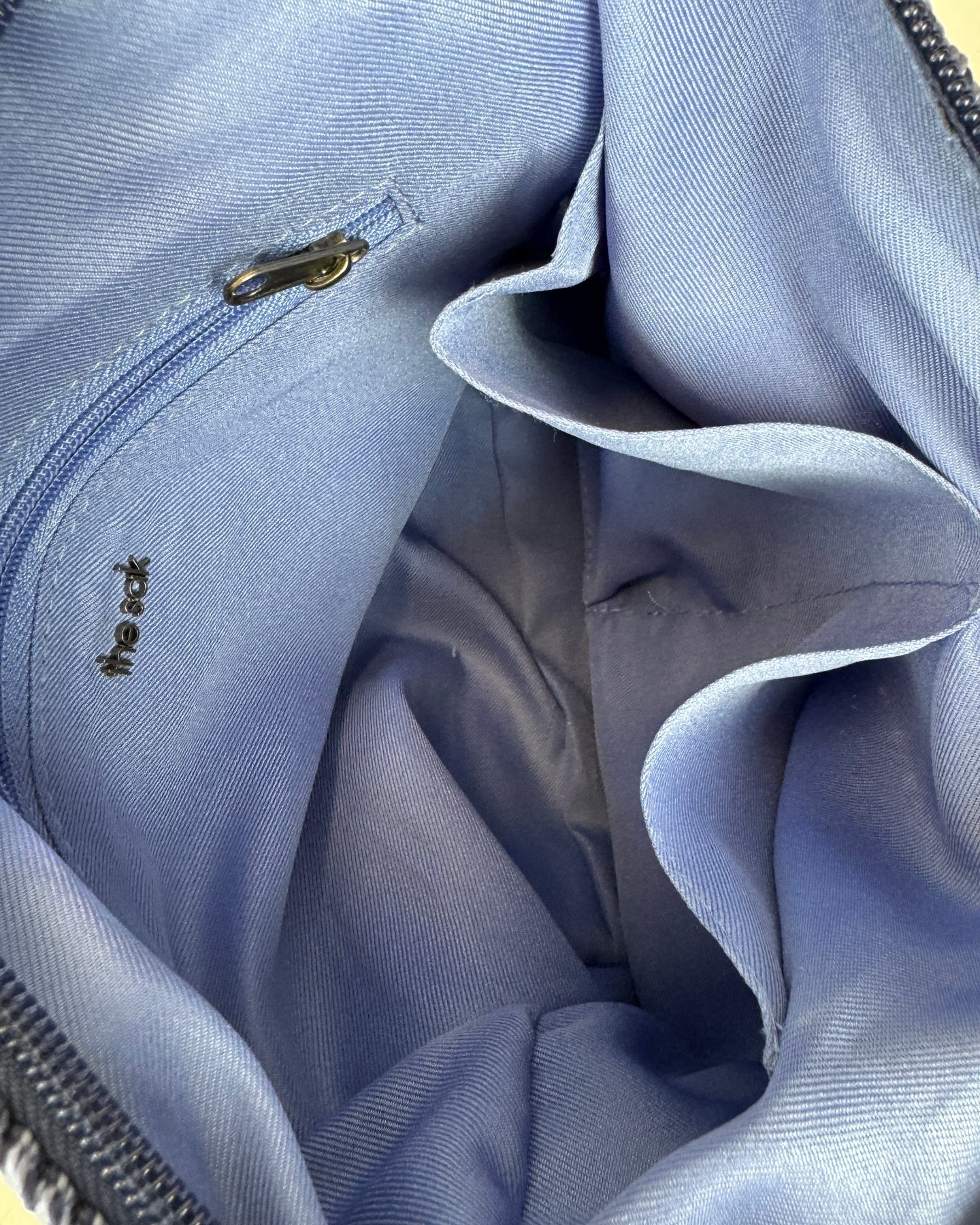 The Sak shades of blue crochet shoulder bag top zipper and back exterior zipper pocket, and interior pocket and zipper pocket