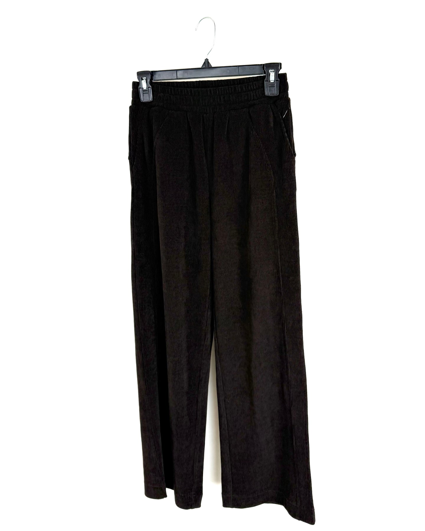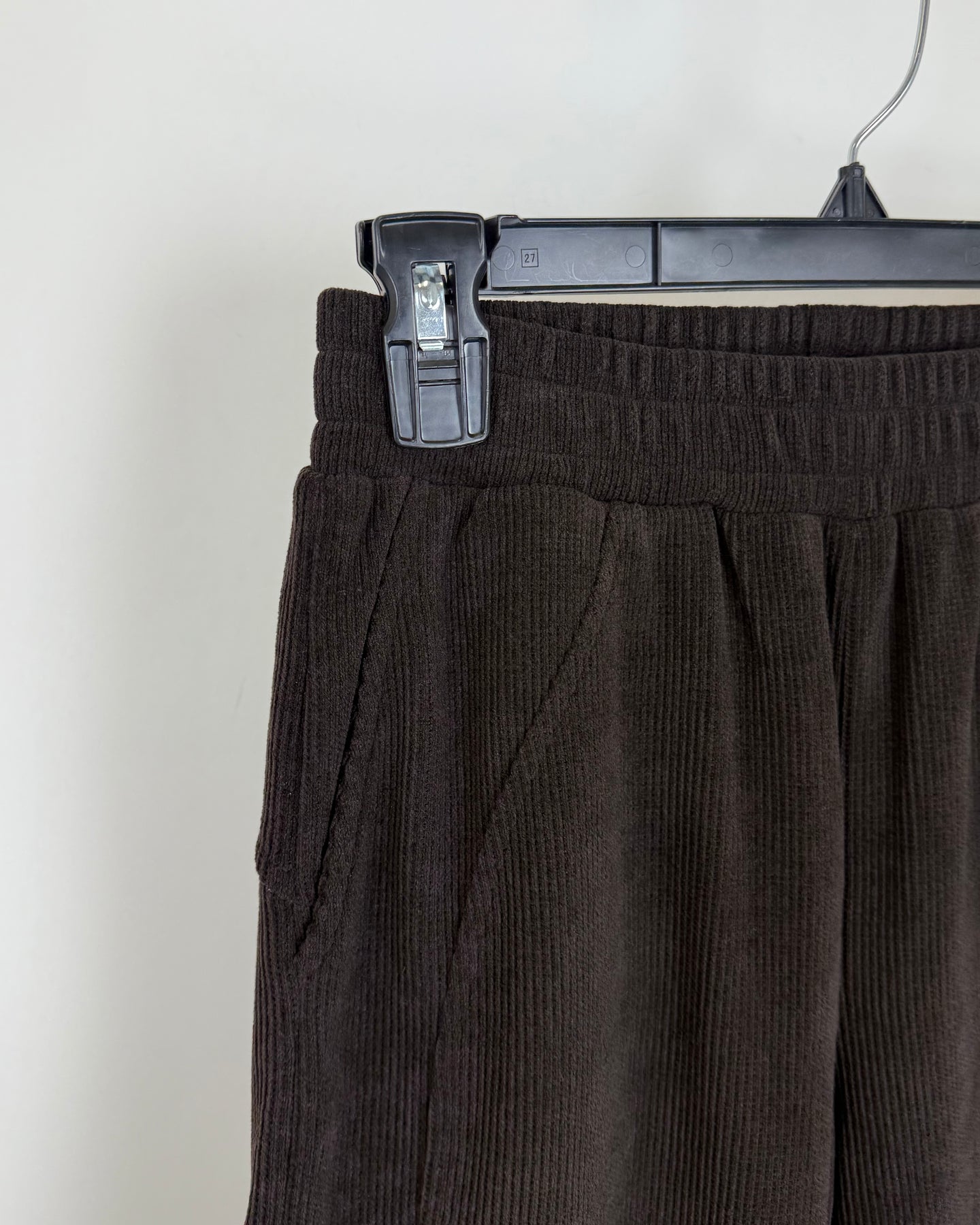 Dark brown knitted wide leg pants with two side pockets and elastic waistband