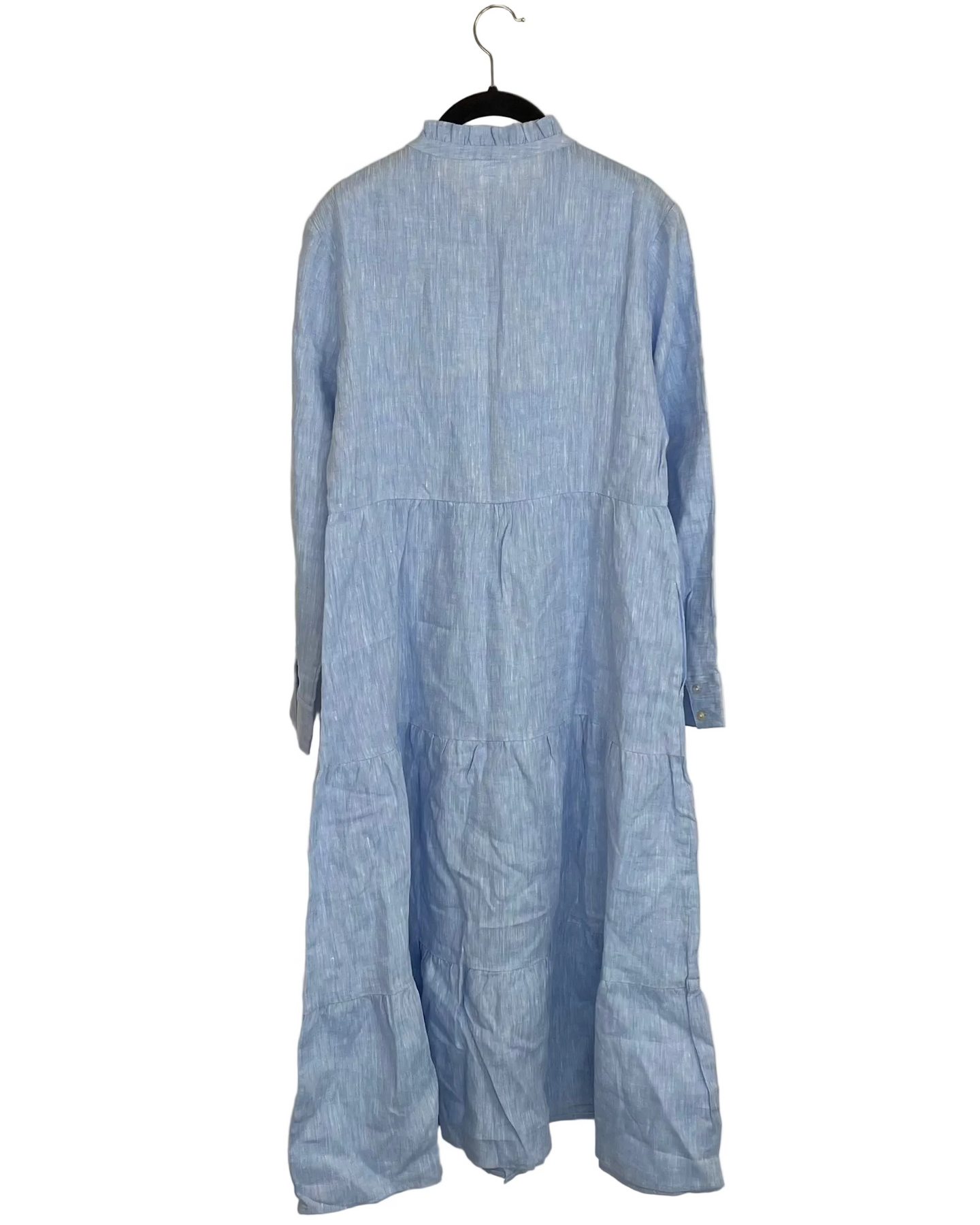 Alice Walk sky blue long linen dress with full button up front, ruffle neckline, side pockets, long sleeves with button hem closure, tapered waistline and double ruffle hem in a pullover flouncy silhouette