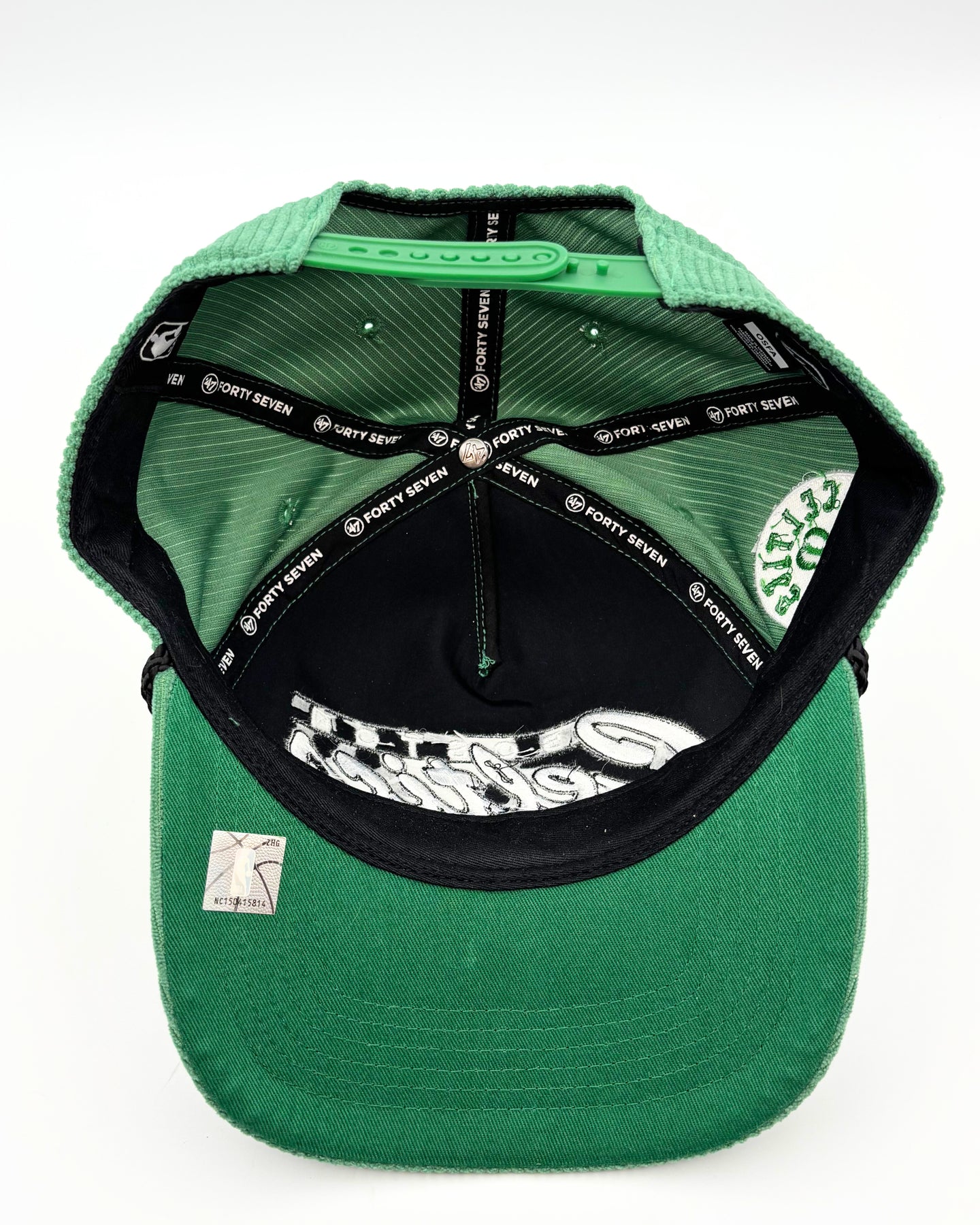 47 Brand Boston Celtics green corduroy hat with a black rope detail around the cap, "Boston Celtics" embroidered on the front in black and white writing, a green shamrock Celtics logo on the right side, and an adjustable closure on the back