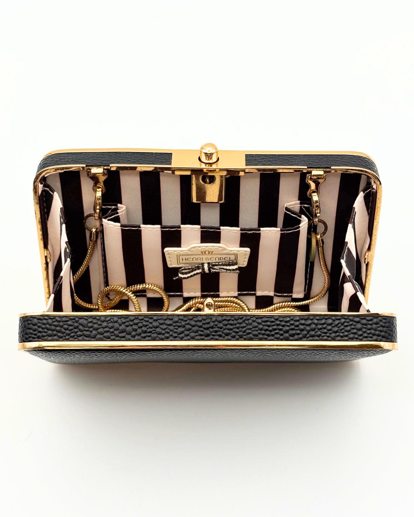 Henri Bendel black structured mini bag with gold hardware, removable gold chain strap for a clutch look, lock closure and mini interior pocket