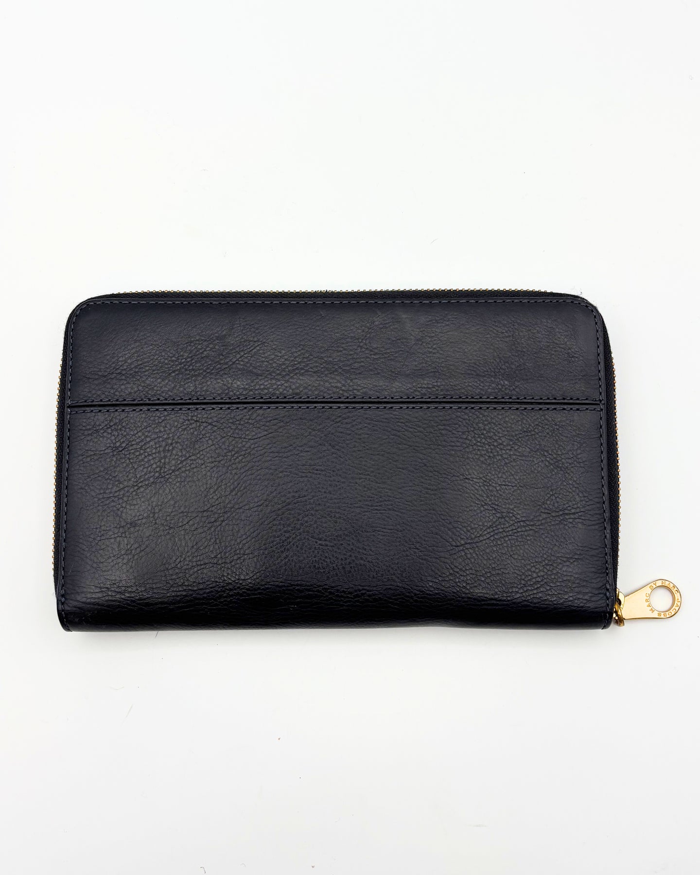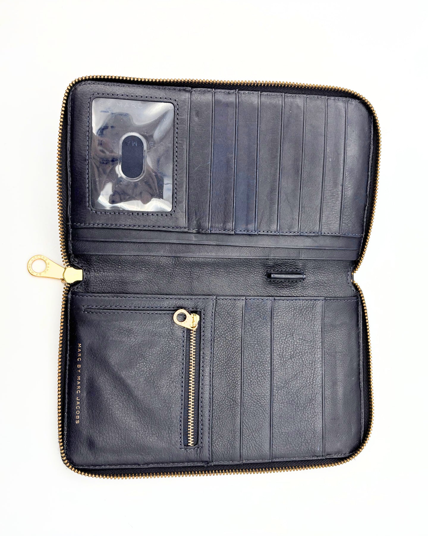 Marc Jacobs navy clutch or large wallet with gold zipper closure and interior card slots, a zip coin pocket and interior slip pockets and exterior zip pocket. Please note slight scratches on leather