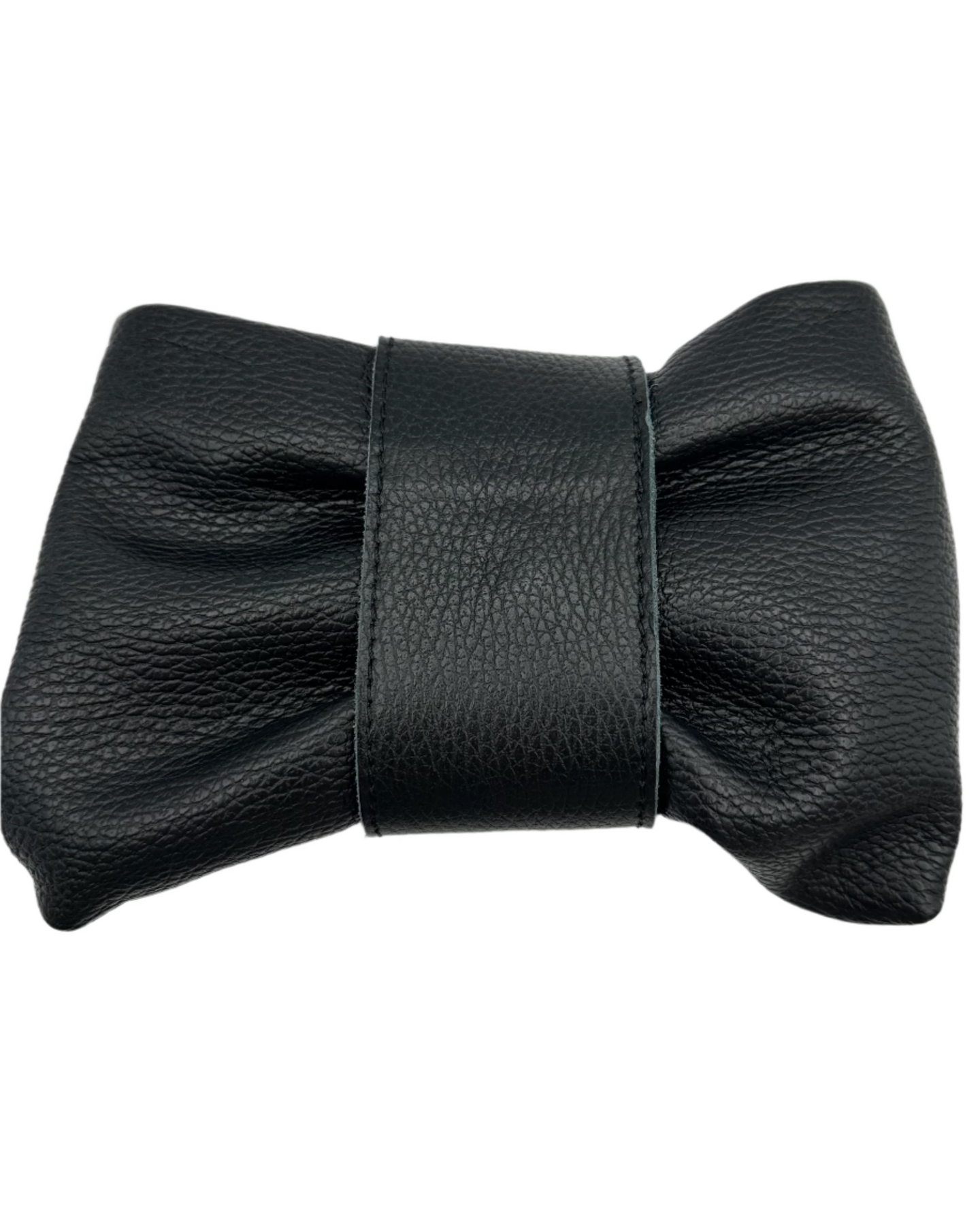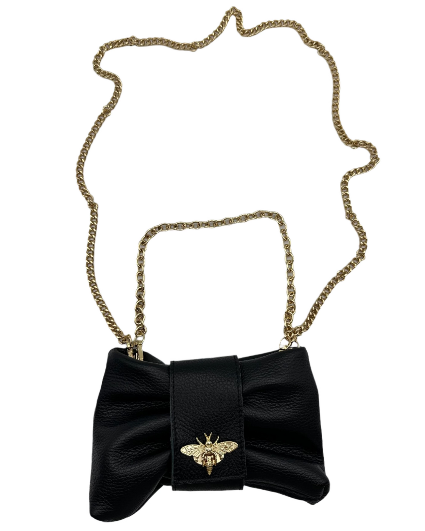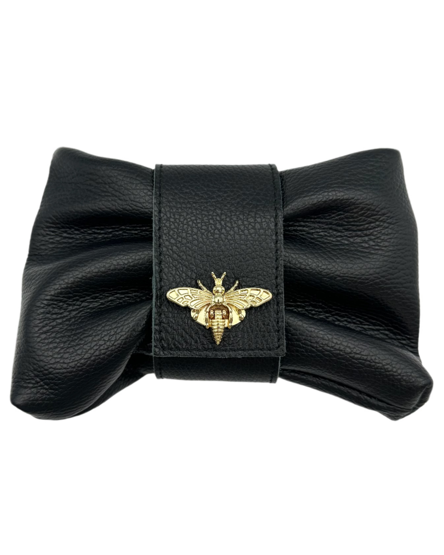 Persaman New York genuine black leather clutch that is shaped as a bow with a removable long strap and a removable shoulder strap, top zipper closure and a gold bee clasp accent