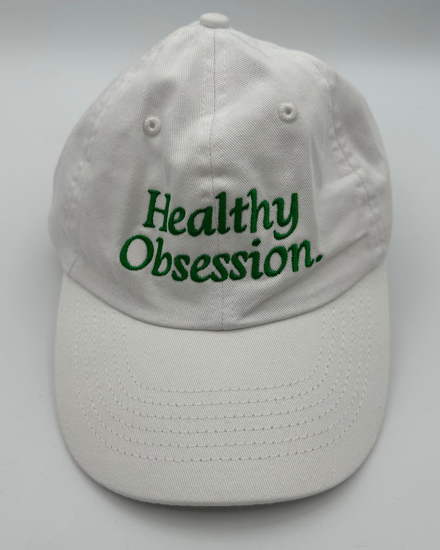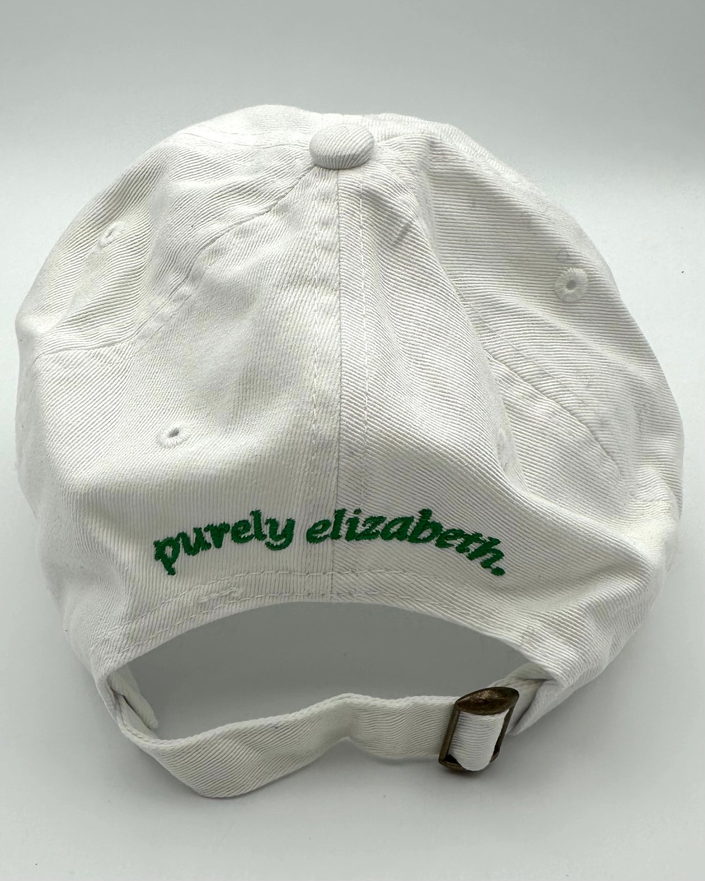 Purely Elizabeth white hat, baseball cap style with green embroidered front with "Healthy Obsession" text, back embroidery with "Purely Elizabeth" logo, and adjustable back with silver buckle