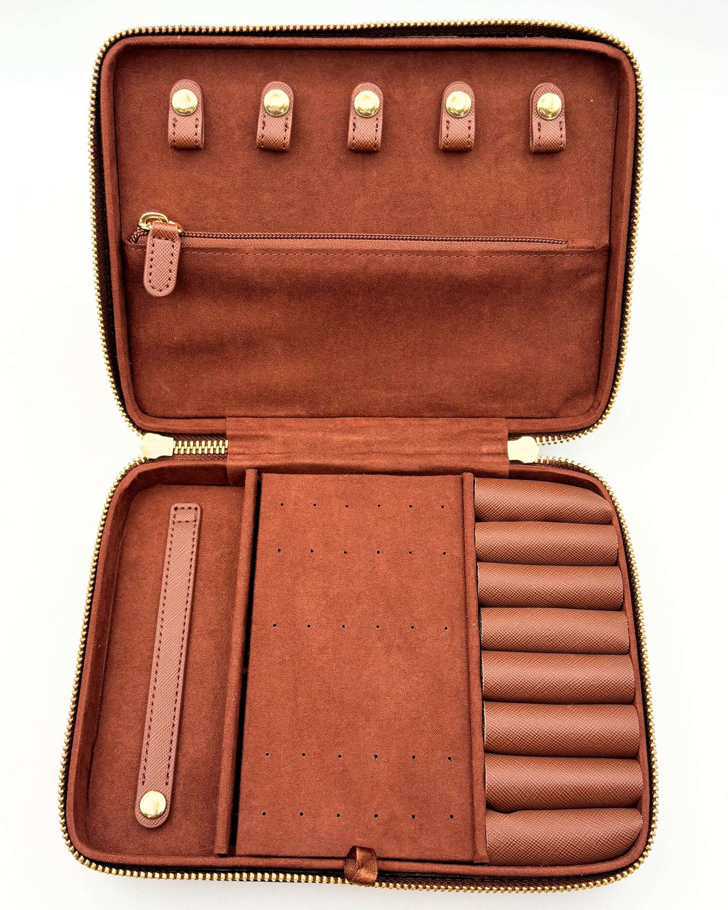 Stoney Clover Lane brown solid jewelry case with gold hardware, jewelry organizers on the inside for rings and earrings that lifts to more compartments, a zipper pocket, clasp hooks for hanging jewelry, and a zipper closure