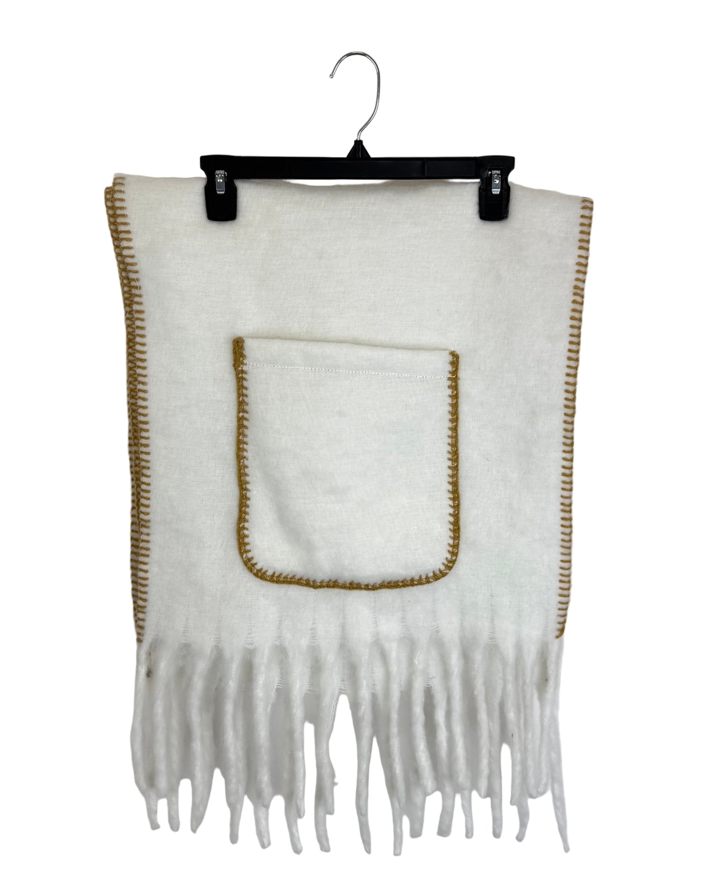 White thick & fuzzy scarf with two large pockets and fringe on each side
