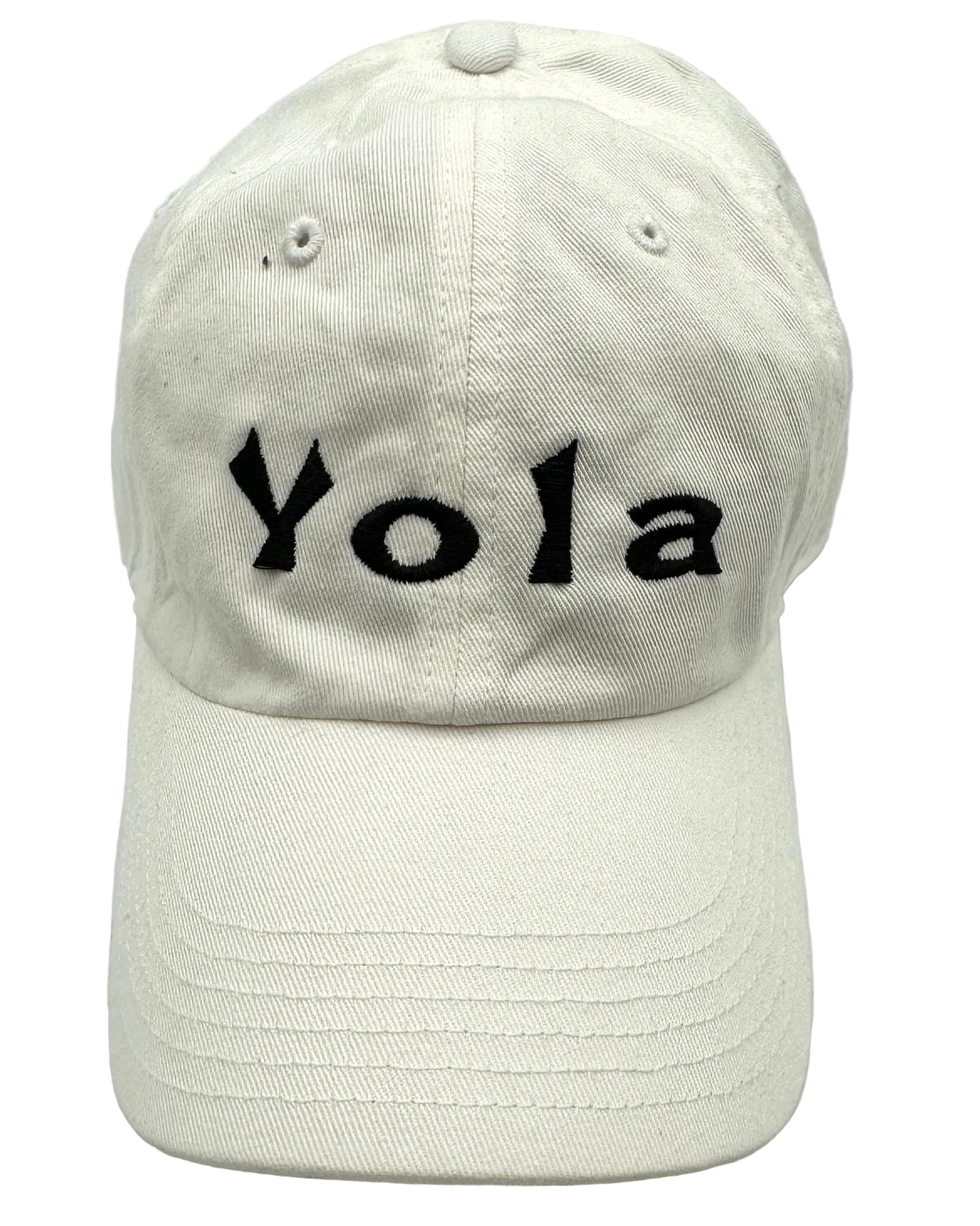 White baseball cap with "Yola" embroidered in black on the front, "Mezcal" embroidered on the back, and an adjustable back.