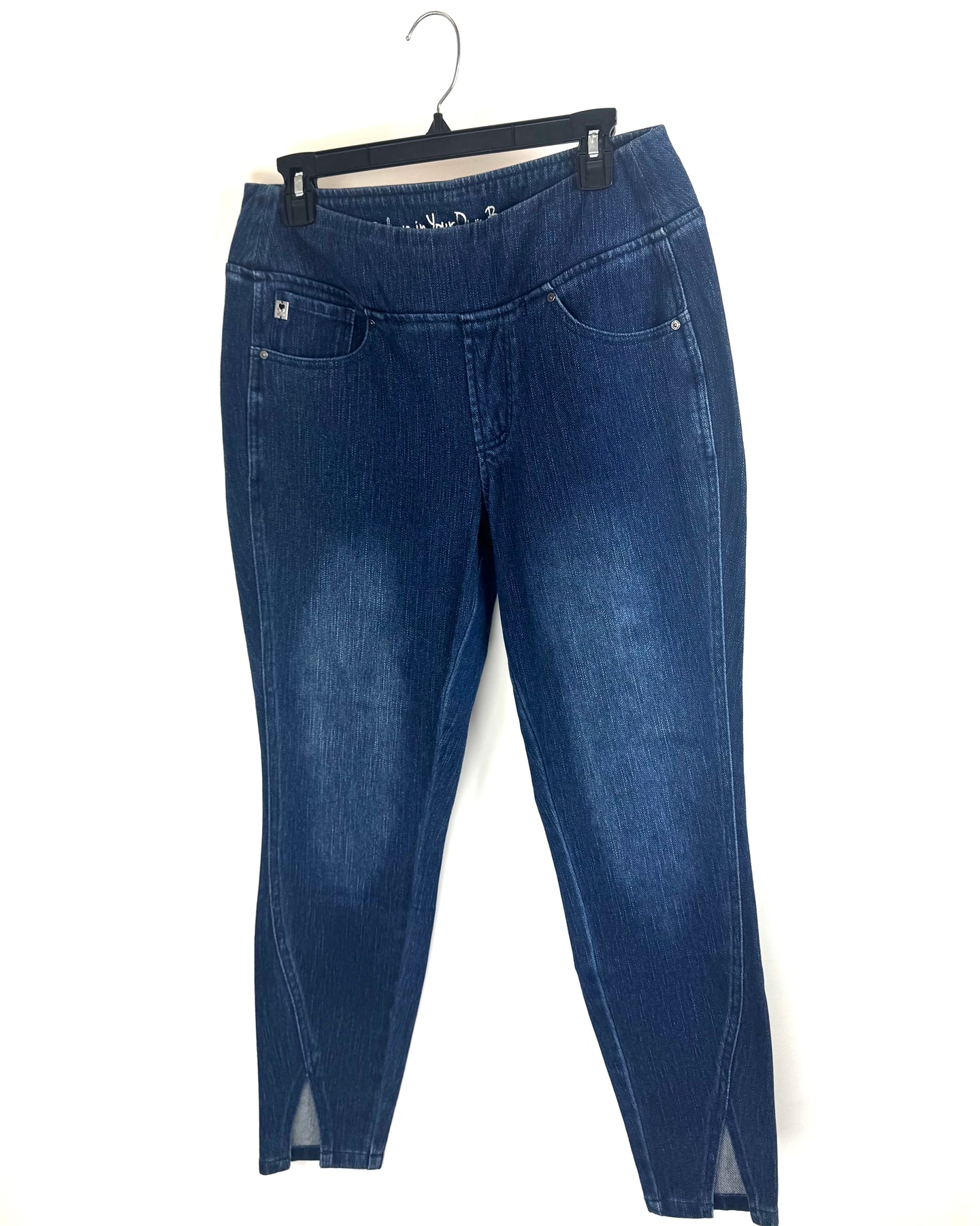 Belle by Kim Gravel dark-wash pull-on skinny jeans with ankle slit, real front and back pockets, subtle fading on the thighs, flattering pull-on waistband and no zipper or button closure