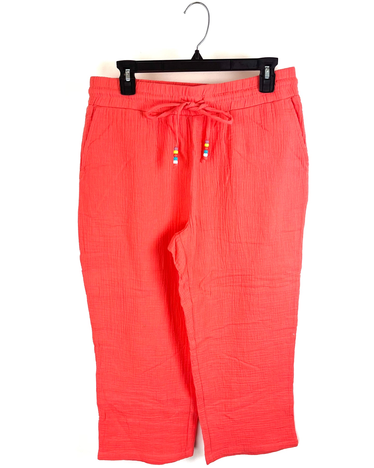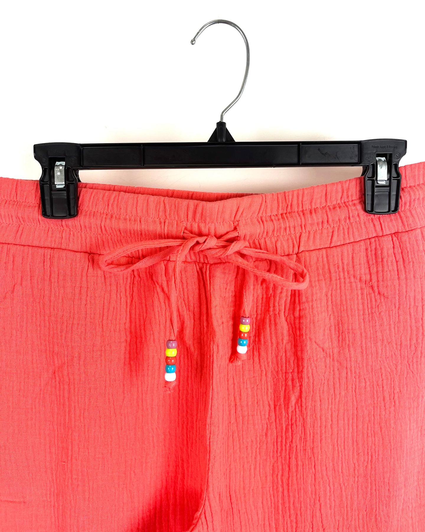 Belle By Kim Gravel salmon colored flowy capri pants with elastic stretch adjustable strings on waistband, colorful beads on waistband strings, side pockets, soft, stretchy, comfortable and lightweight