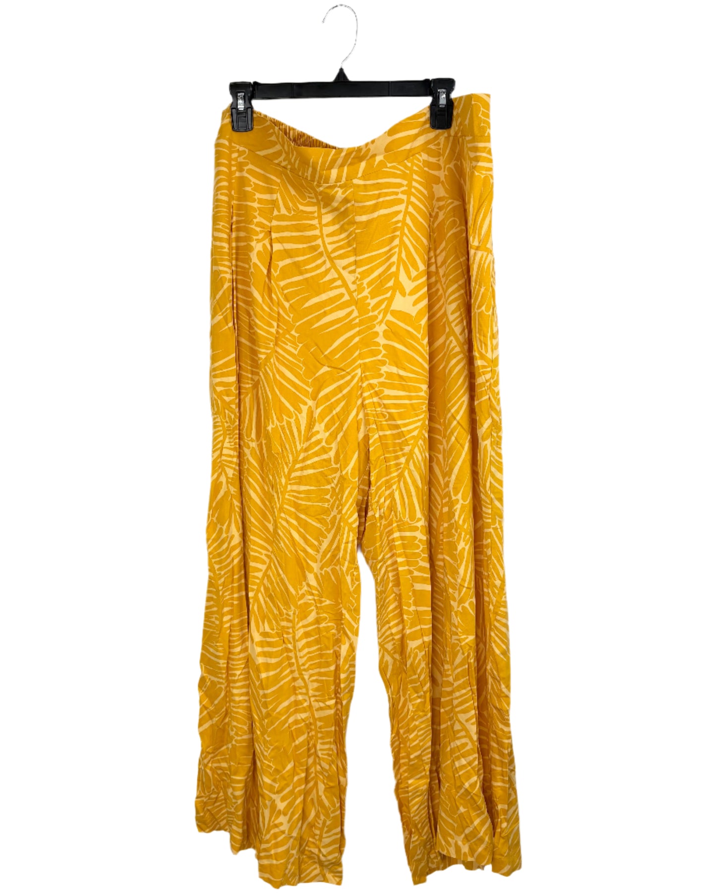 Nina Parker wide leg yellow palm leaf patterned pants with a stretchy elastic waistband made in a soft lightweight material