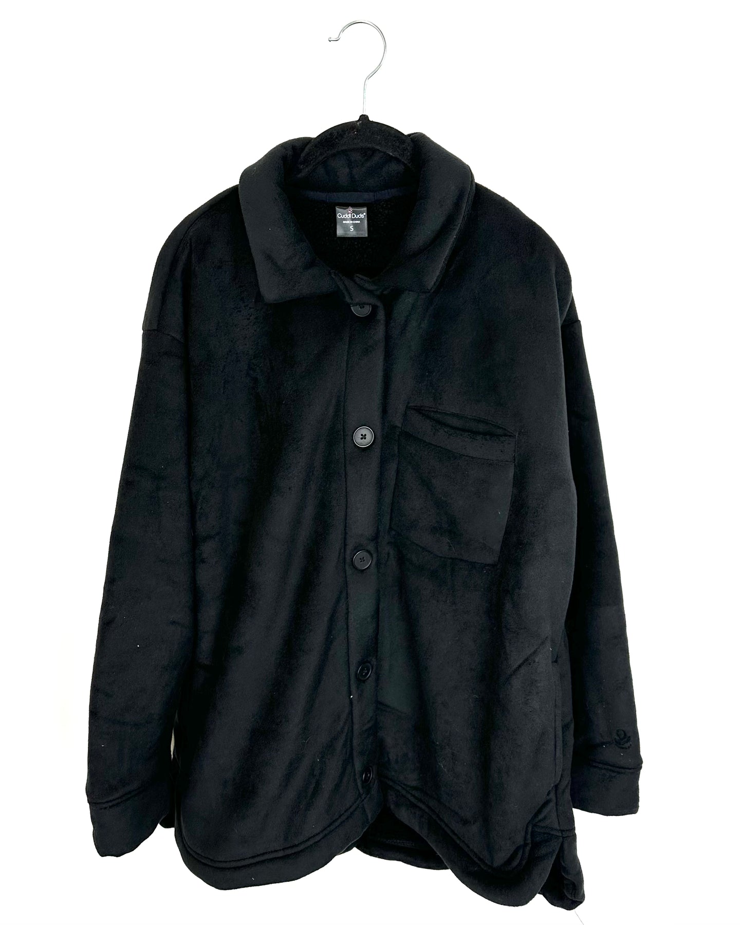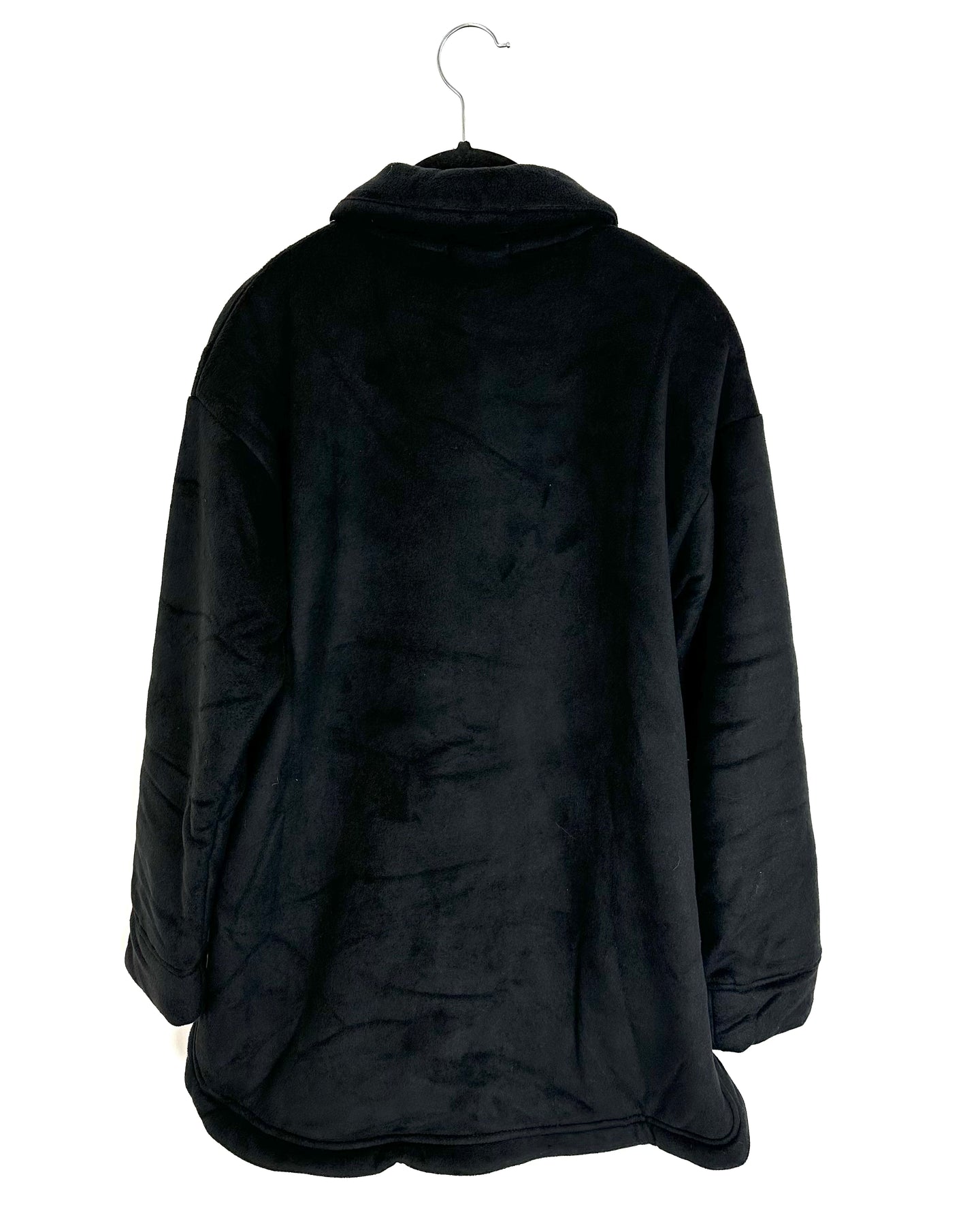 Cuddl Dud black sherpa coat with super plush sherpa interior lining, collared neckline, long sleeves, button up front, side pickets and single chest pocket