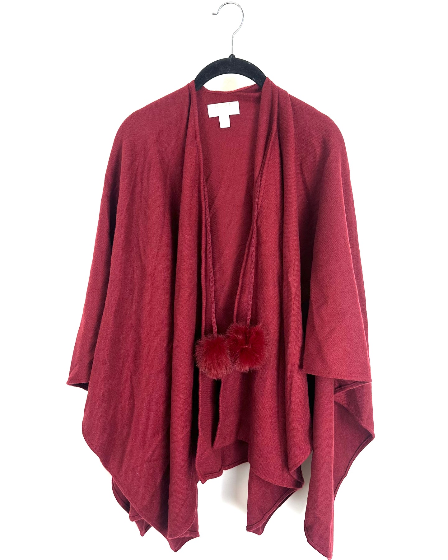 Kim Gravel burgundy soft shawl featuring faux fur pom pom tassels along the front with a wide comfy fit