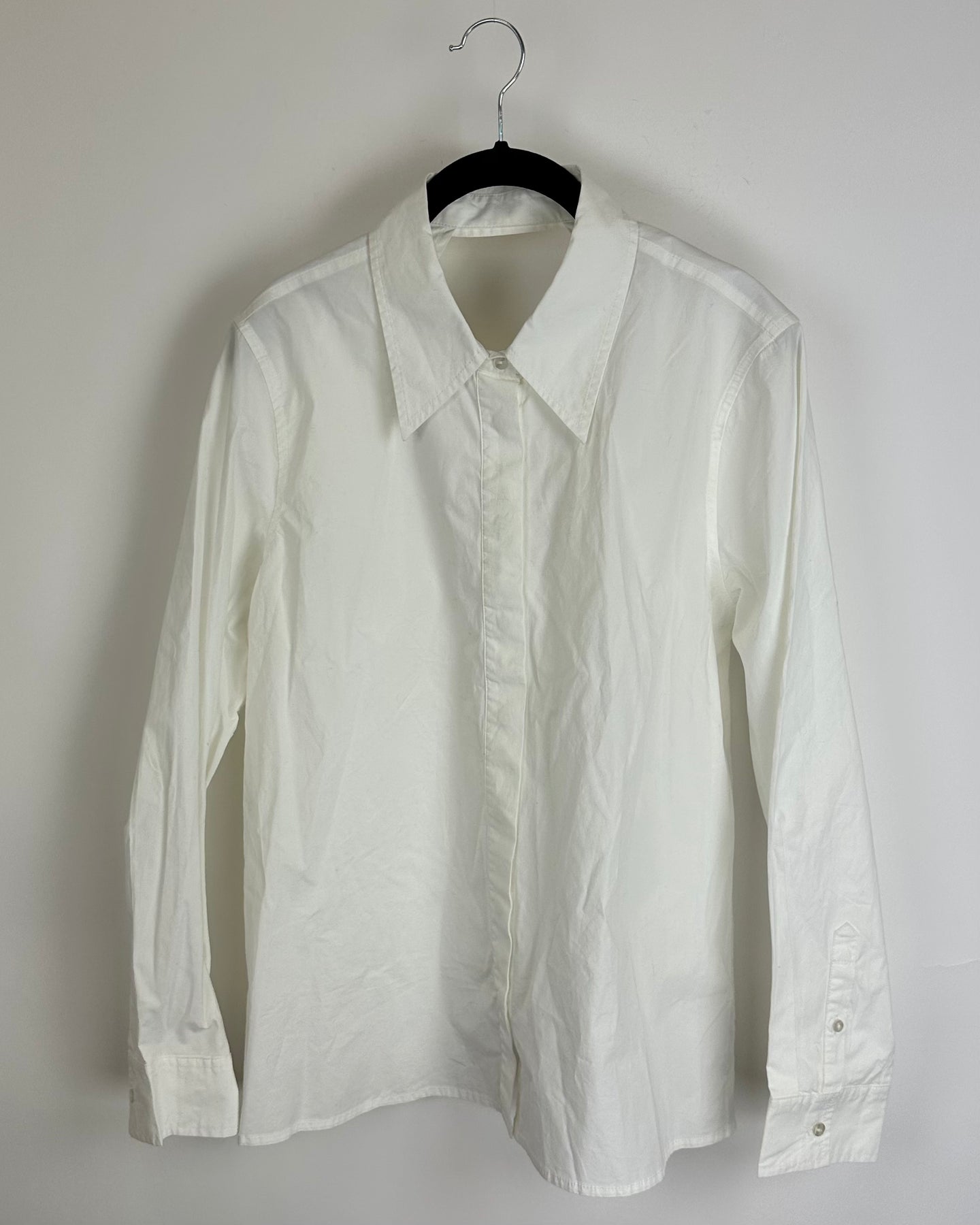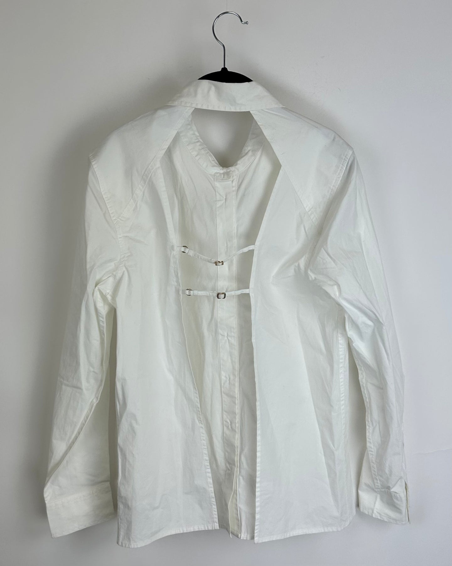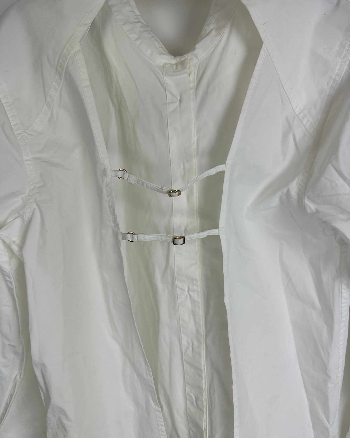 Cult Gaia x Gap white long sleeve blouse with collar, hidden front buttons and open back with adjustable straps
