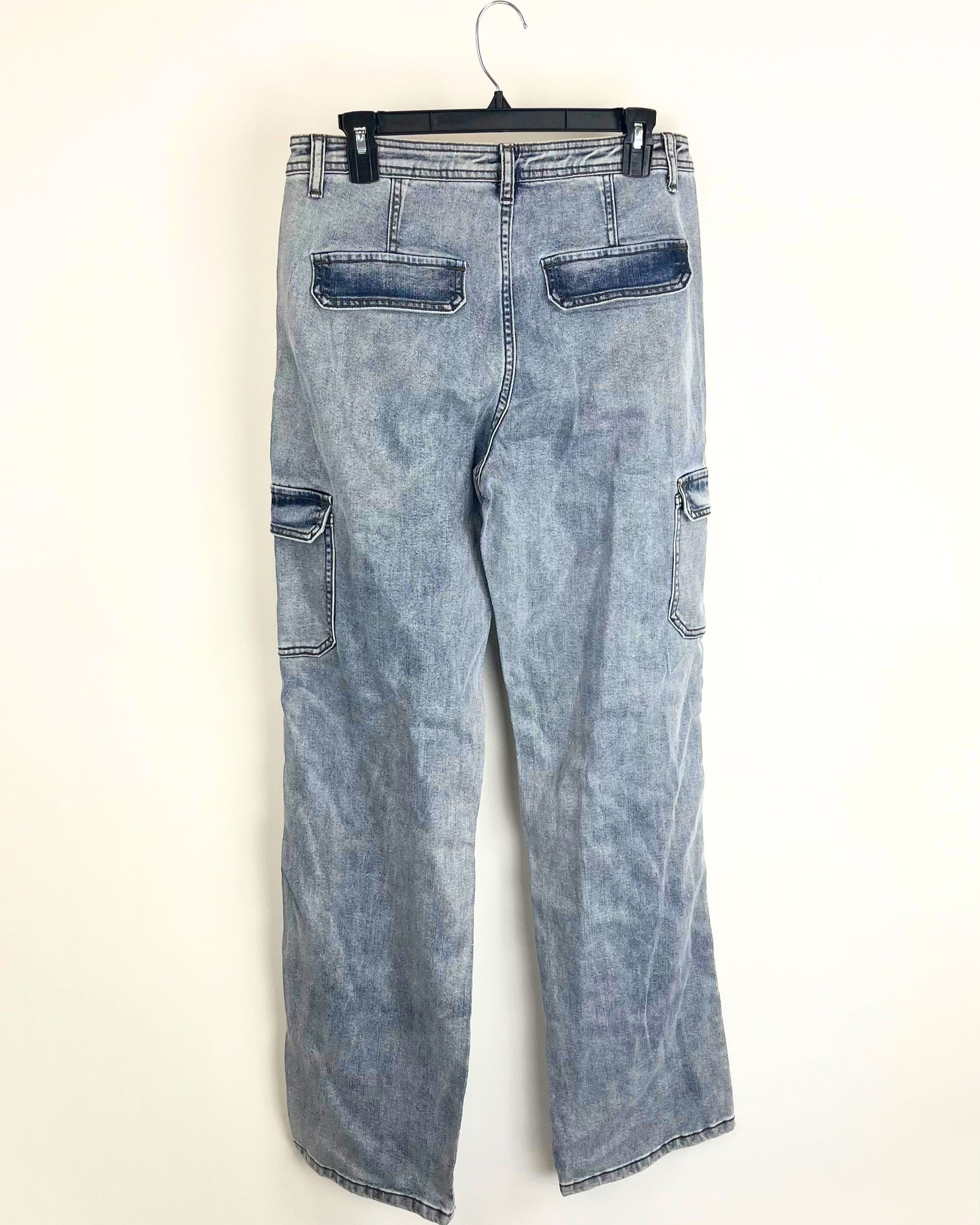 Unknown pants with button & zipper closure, side pockets,back panel pockets with cover detail, cargo pockets on each leg in a lightweight, soft faux denim material.