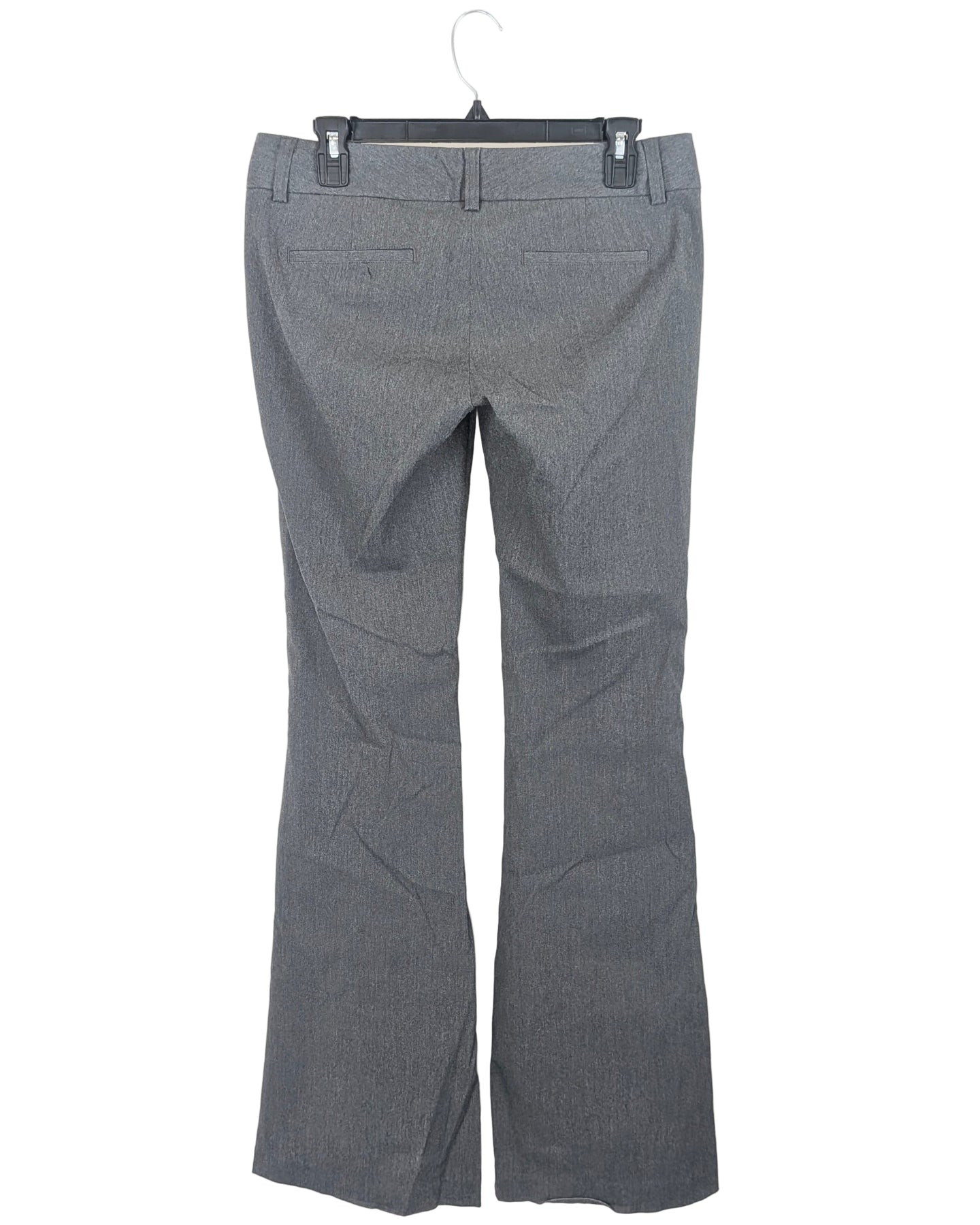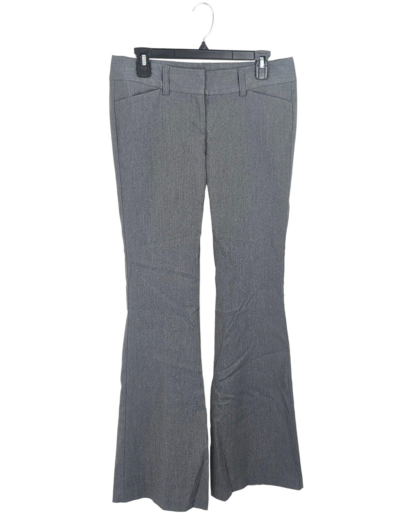 Express heathered gray low rise and bell bottom trousers with pockets, back faux pockets, belt loops and front zipper and hook and eye closure