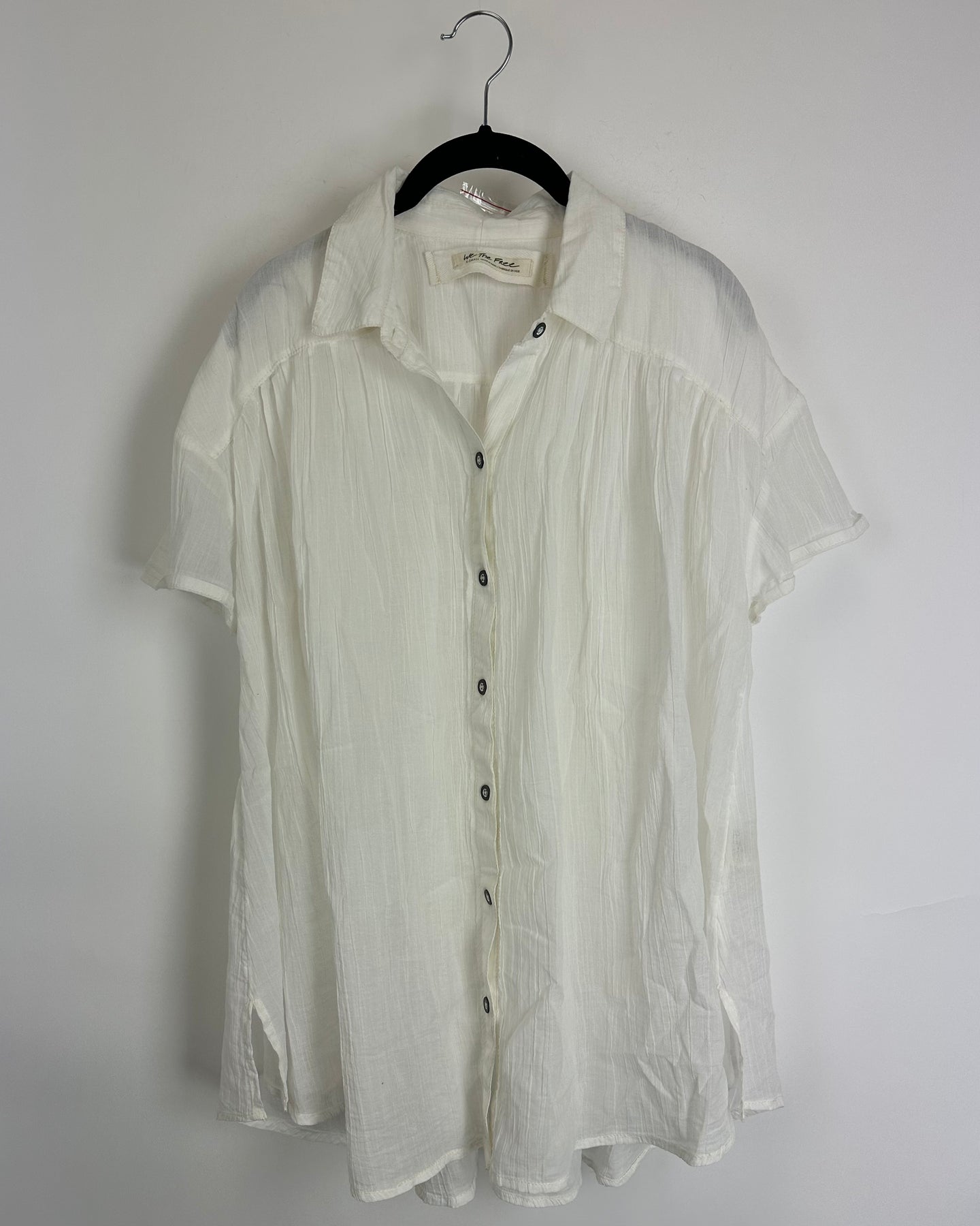 Free People white oversized tunic in a sheer and textured fabric with short sleeves, collar, and front button closure