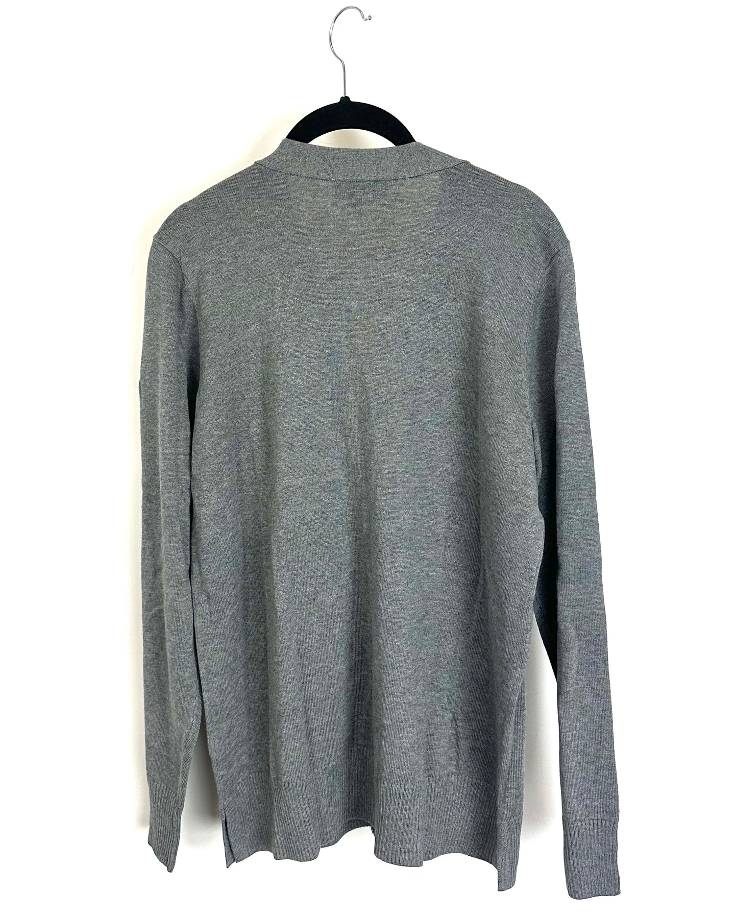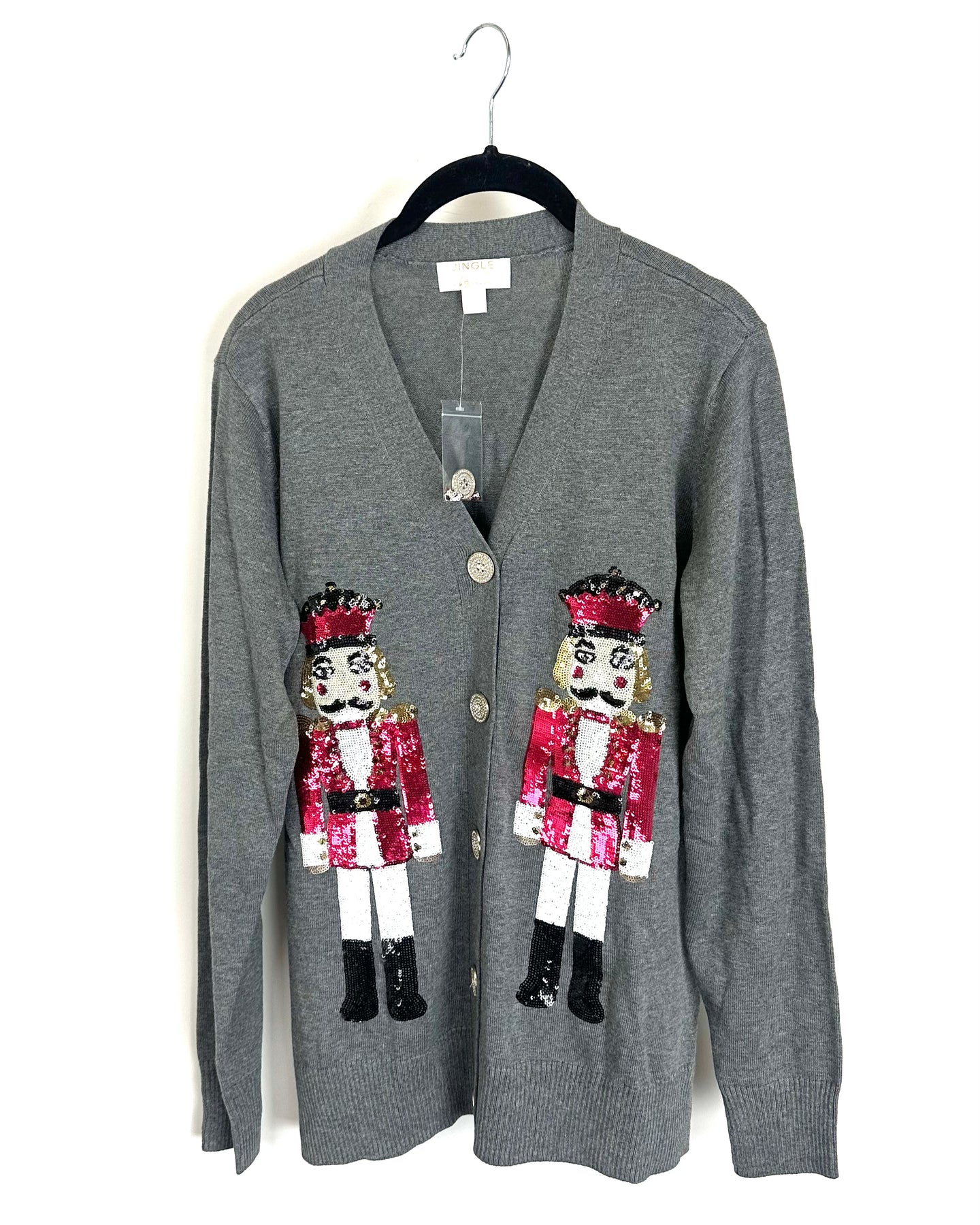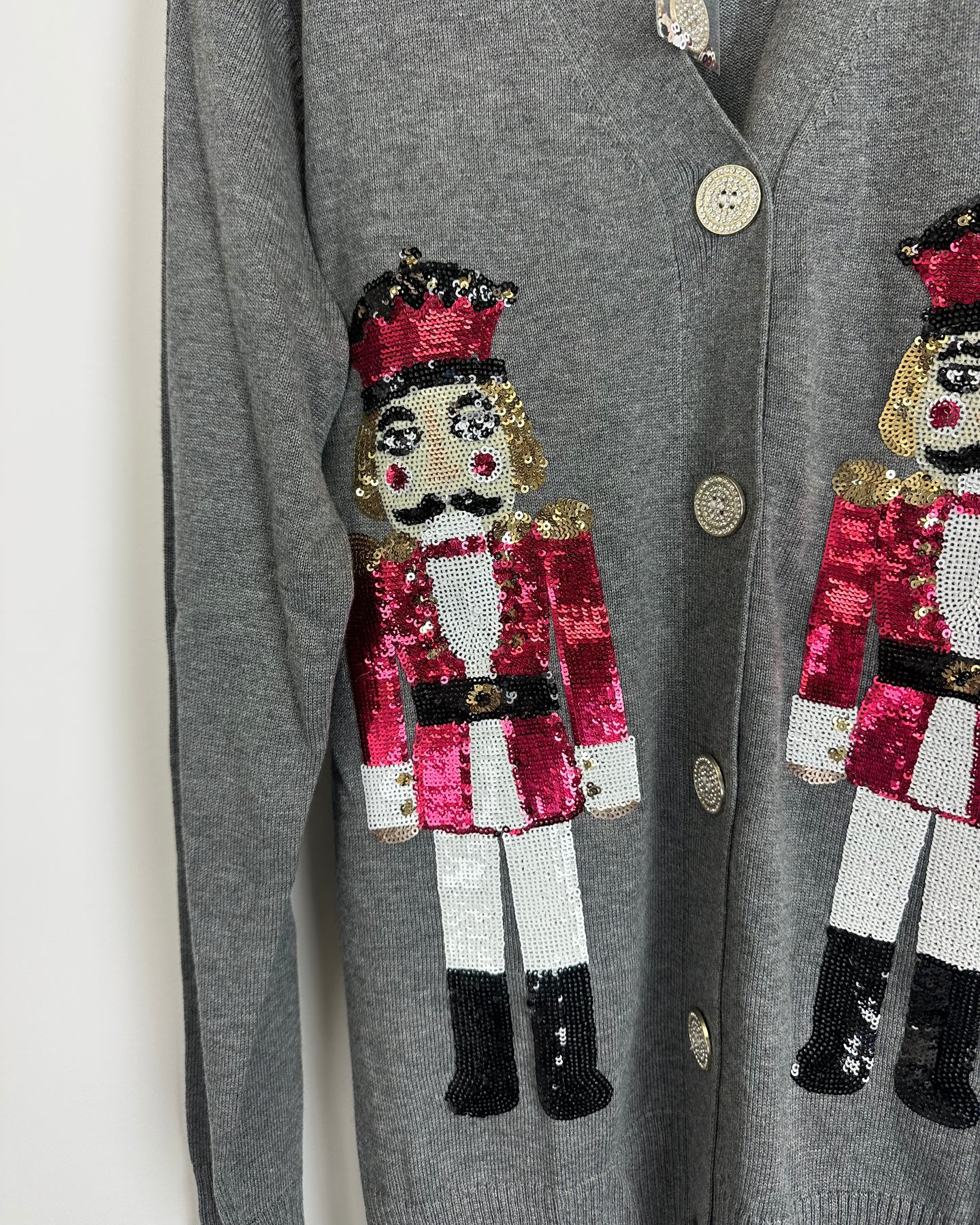 Belle by Kim Gravel sweater with deep v-neckline, 2 sequin nutcrackers on each side panel, gold buttons with rhinestone accents, and long sleeves in a lightweight gray knit material.