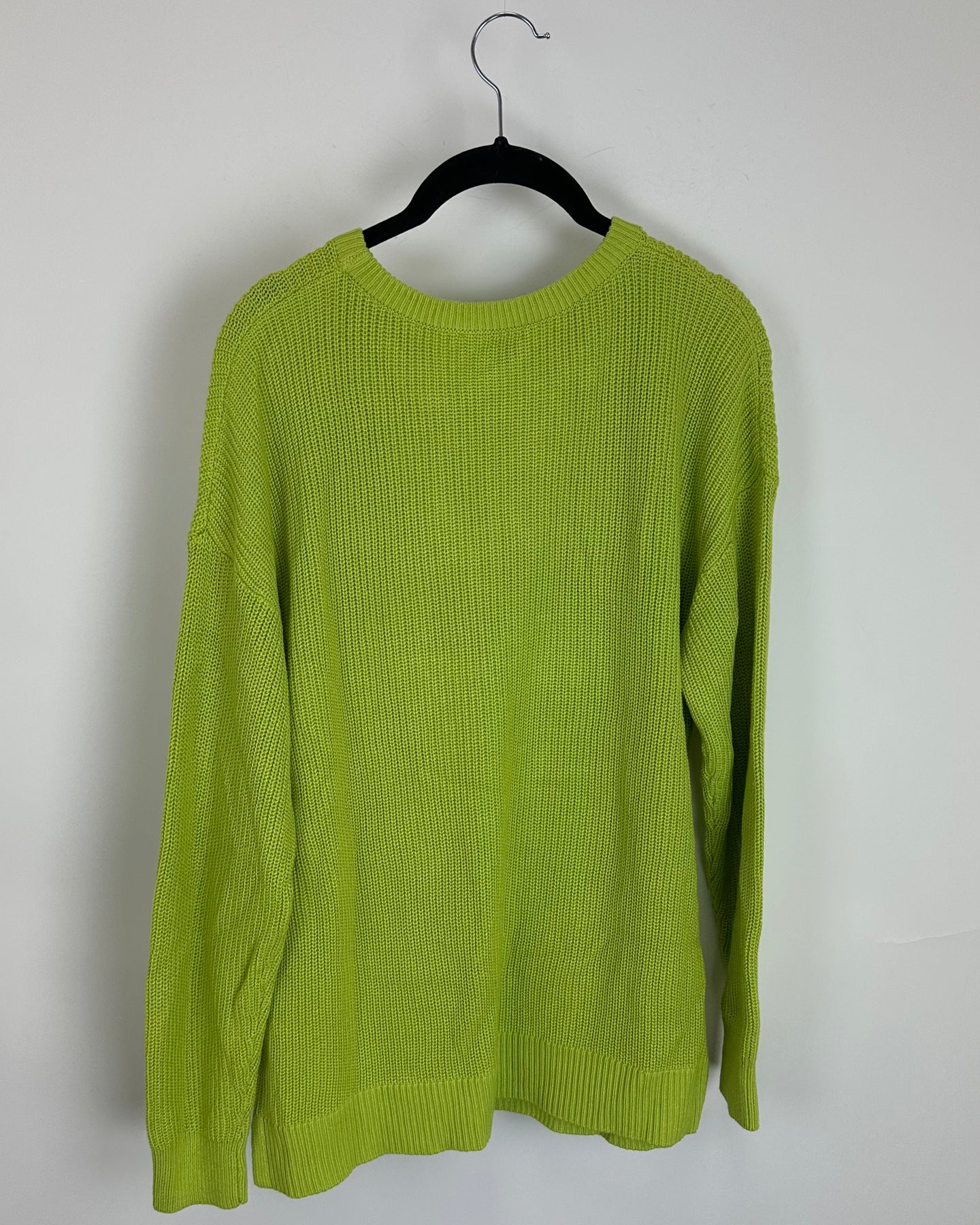 Kim Gravel green holiday sweater featuring a cheerful "jingle belle rock" design across the front, with long sleeves and ribbed hems along the neckline, cuffs, and bottom