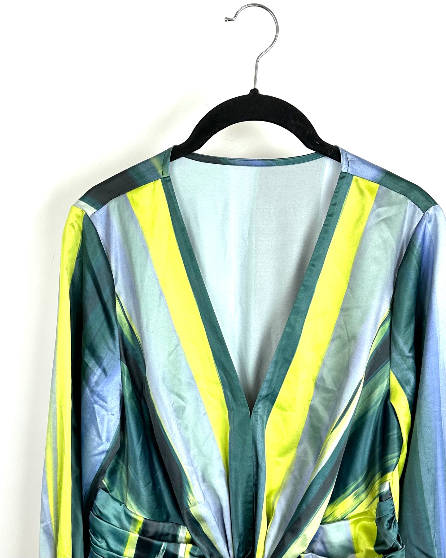 Reunited Clothing green dress with green, blue, and black smooth textured fabric material with slight sheen, V-neckline and front hook-and-eye closure, knotted and pleated waist detailing, 3/4 sleeves with wide cuffs with rounded button closure and asymmetrical hemline