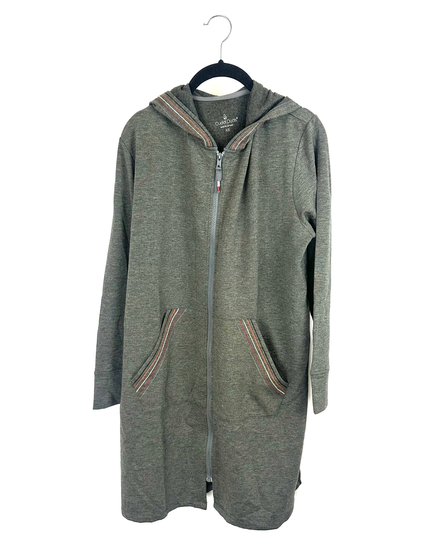Cuddl Duds heather grey lightweight long jacket with a grey zipper front, front pockets, hood and orange, dark red and cream stitching long jacket