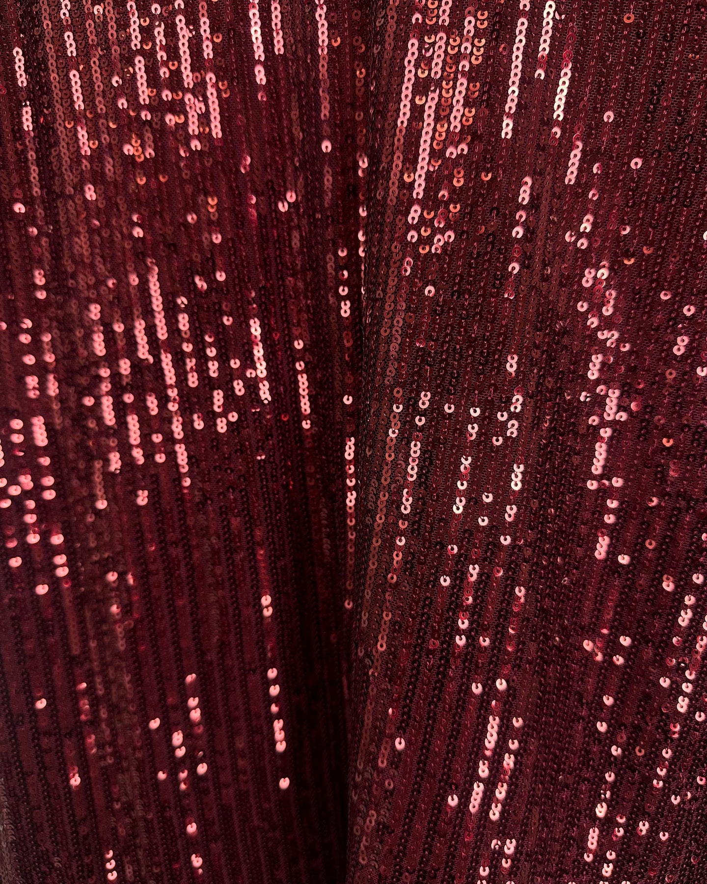 Kim Gravel maroon V-neck shirt, with a sequin pattern on the front half of the shirt, and a cotton back half, lightweight, and breathable