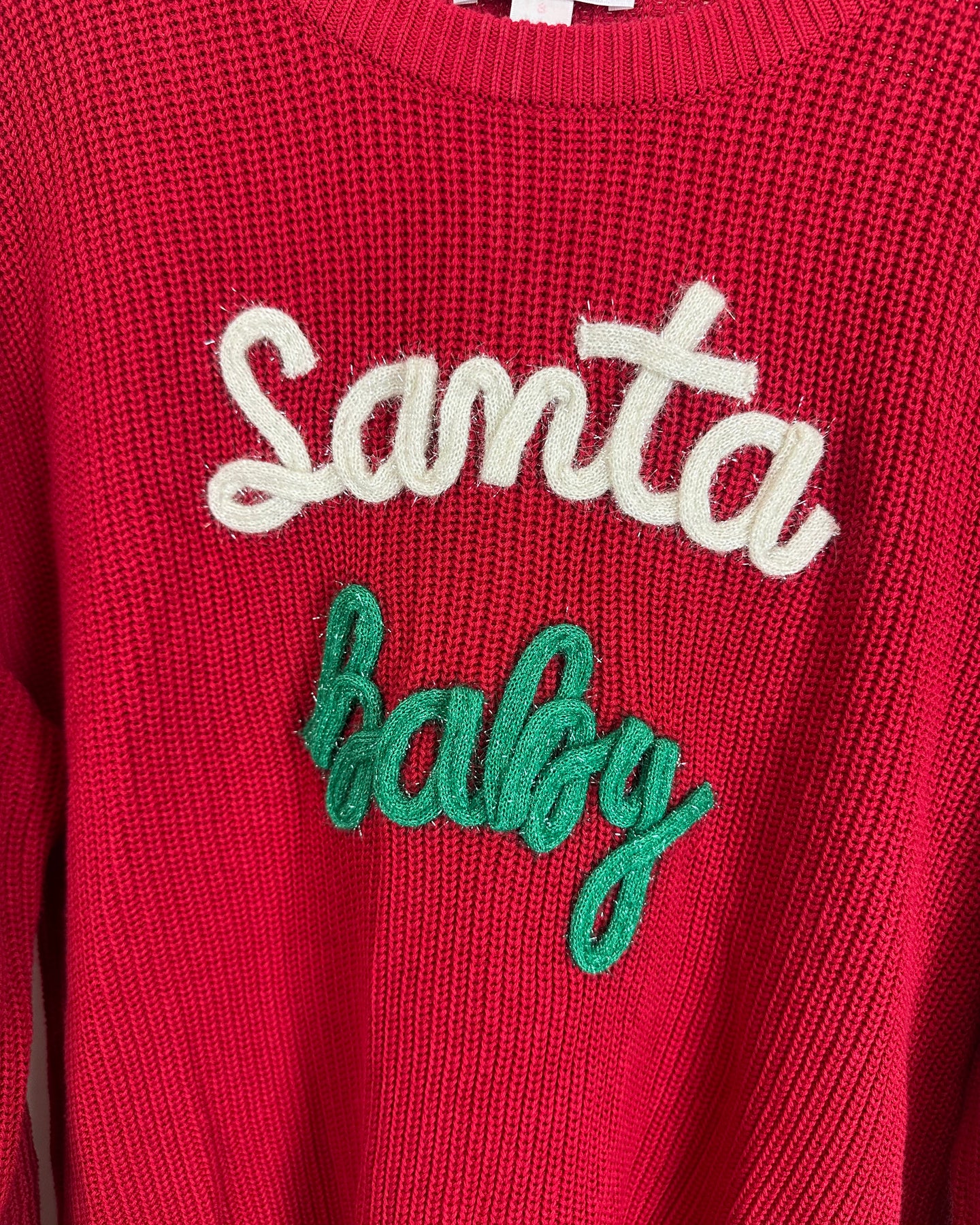 Kim Gravel red holiday sweater featuring a cheerful white and green “Santa Baby” design across the front, with long sleeves and ribbed hems along the neckline, cuffs, and bottom