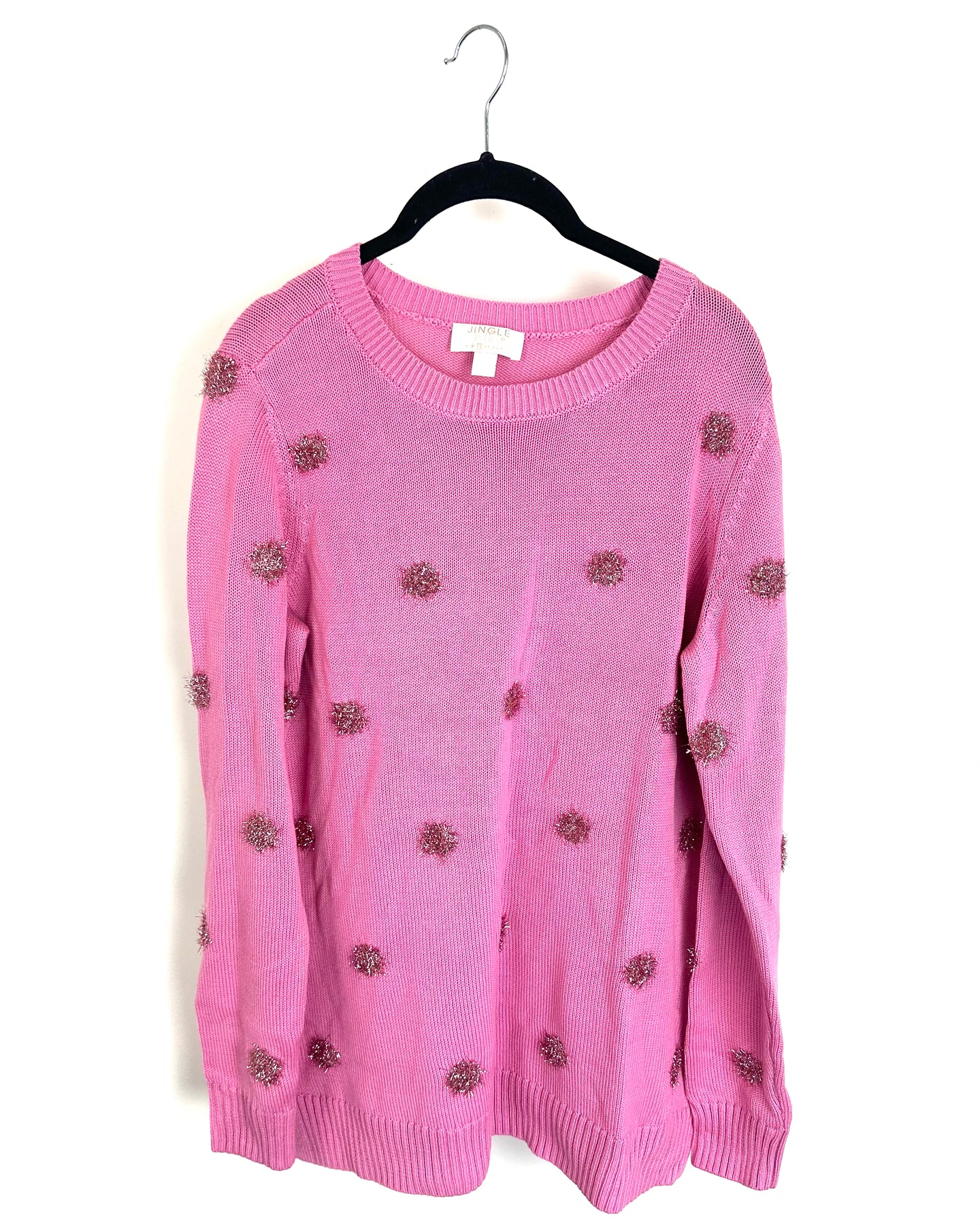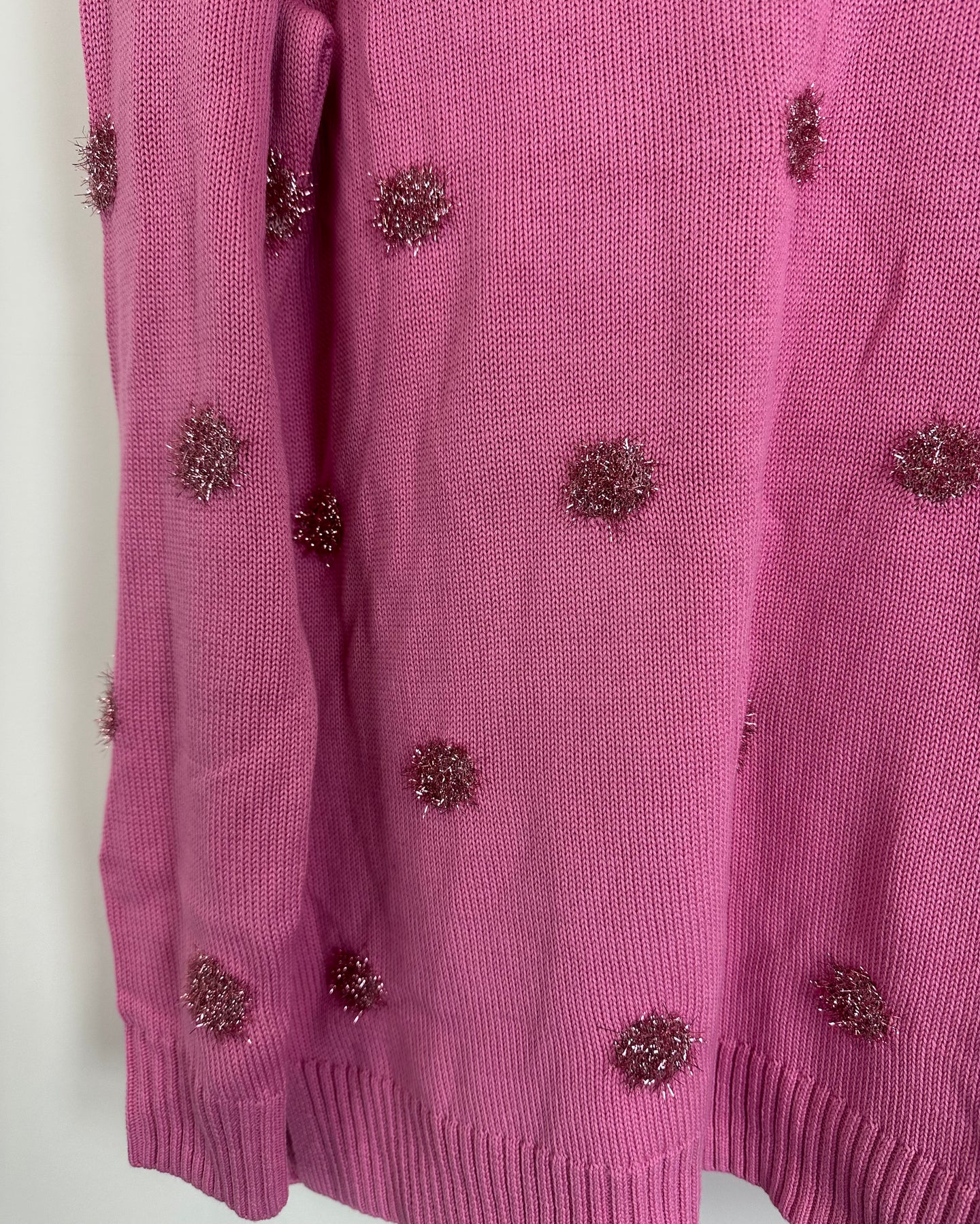 Belle by Kim Gravel sweater with crew neckline, long sleeves, and small side slits in a soft, knit material with pink tinsel polka dots.