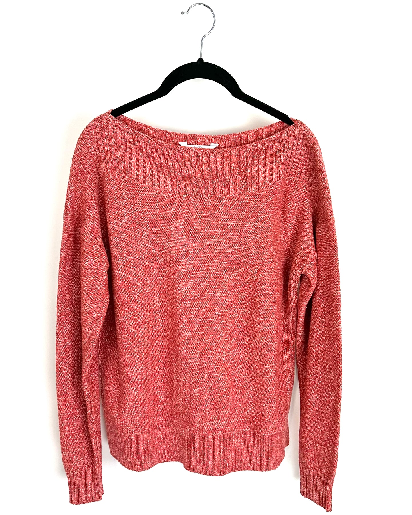 Time and Tru red sweater, woven knit fabric material, wide boat neckline, small slits on side of hemline with long sleeves and ribbed trim on neckline, cuffs, and hemline