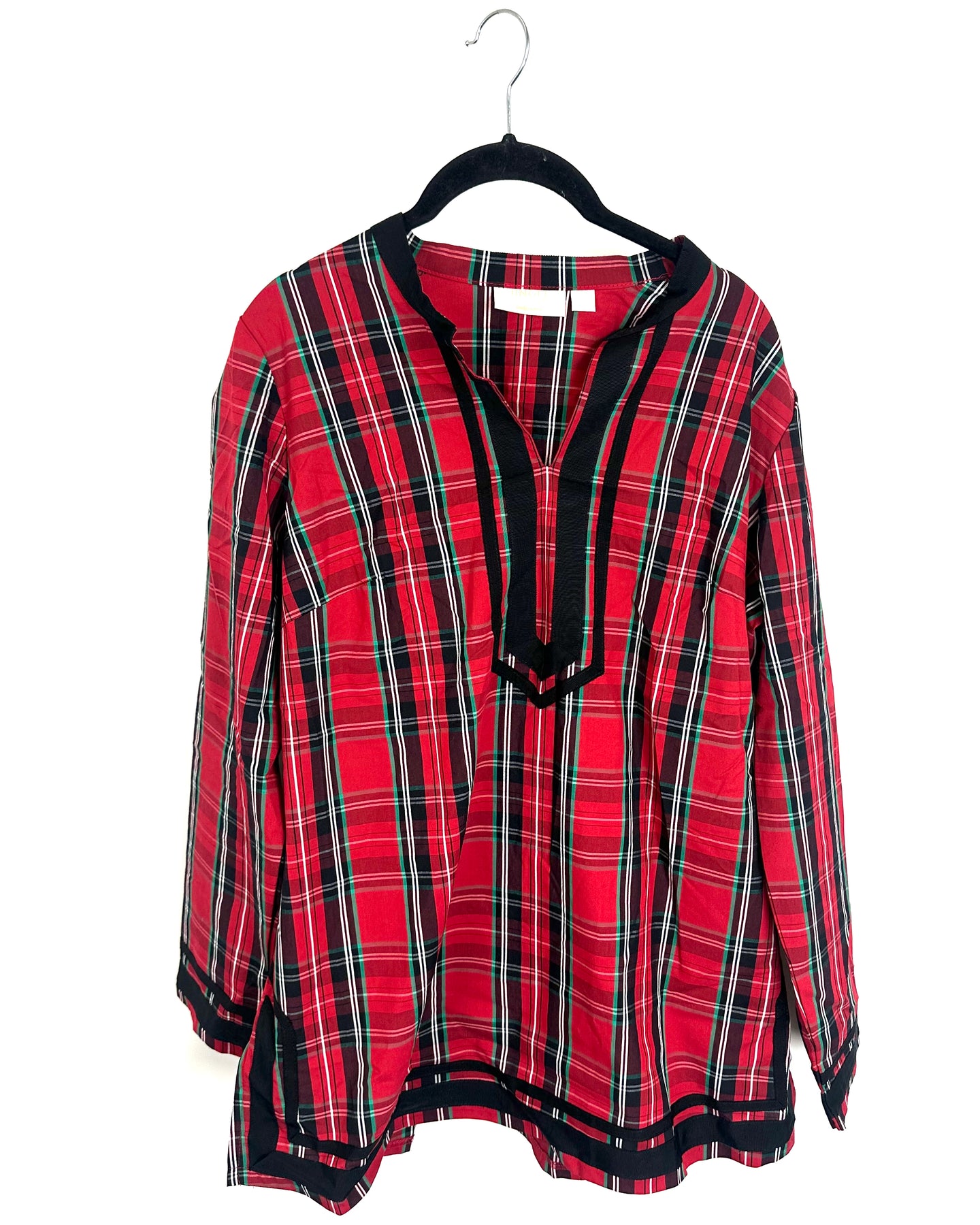 Belle by Kim Gravel tunic top with crew neckline & deep v detailing, black piping on the neckline, cuffs, and waist, and long sleeves in a light weight, red holiday plaid material.