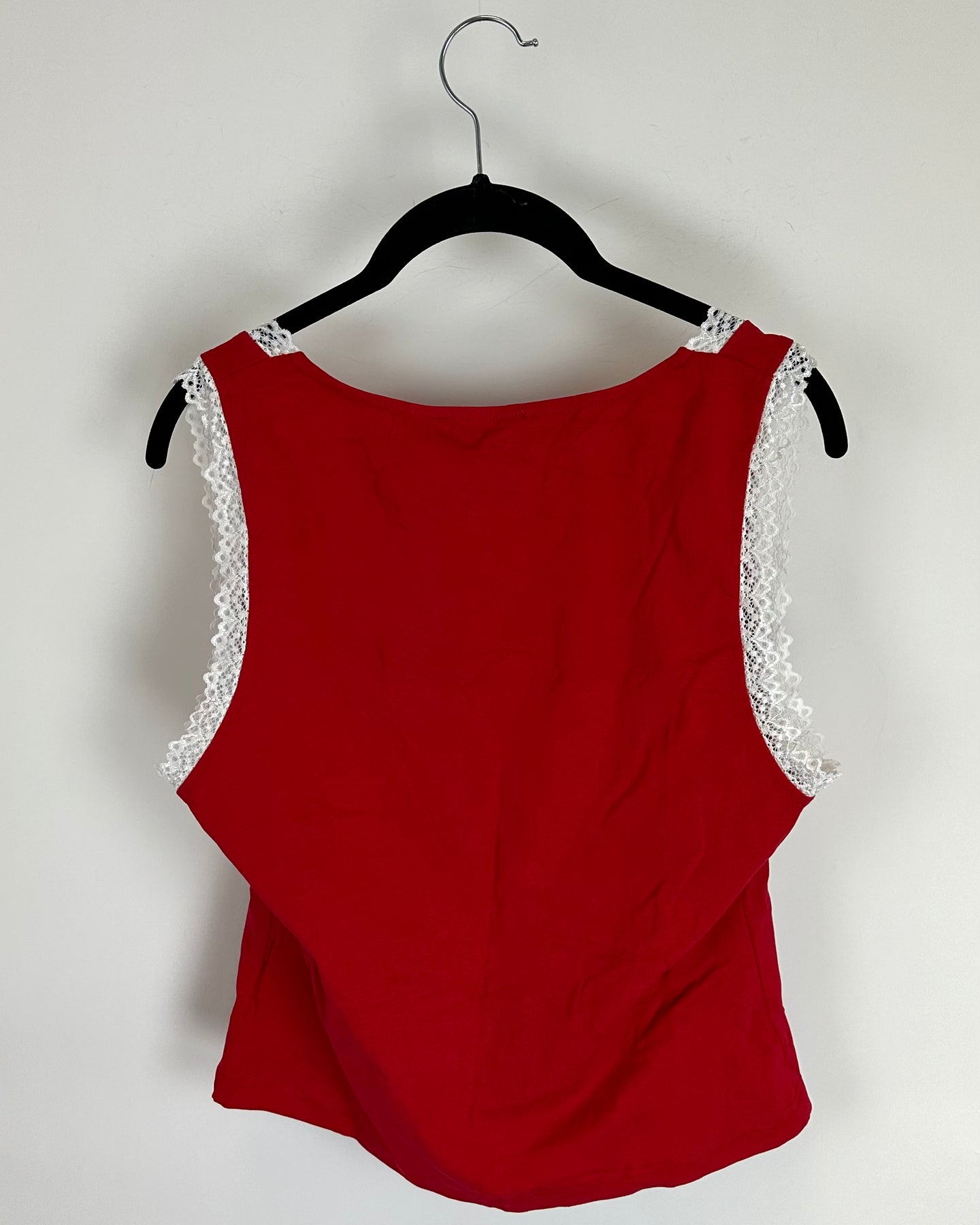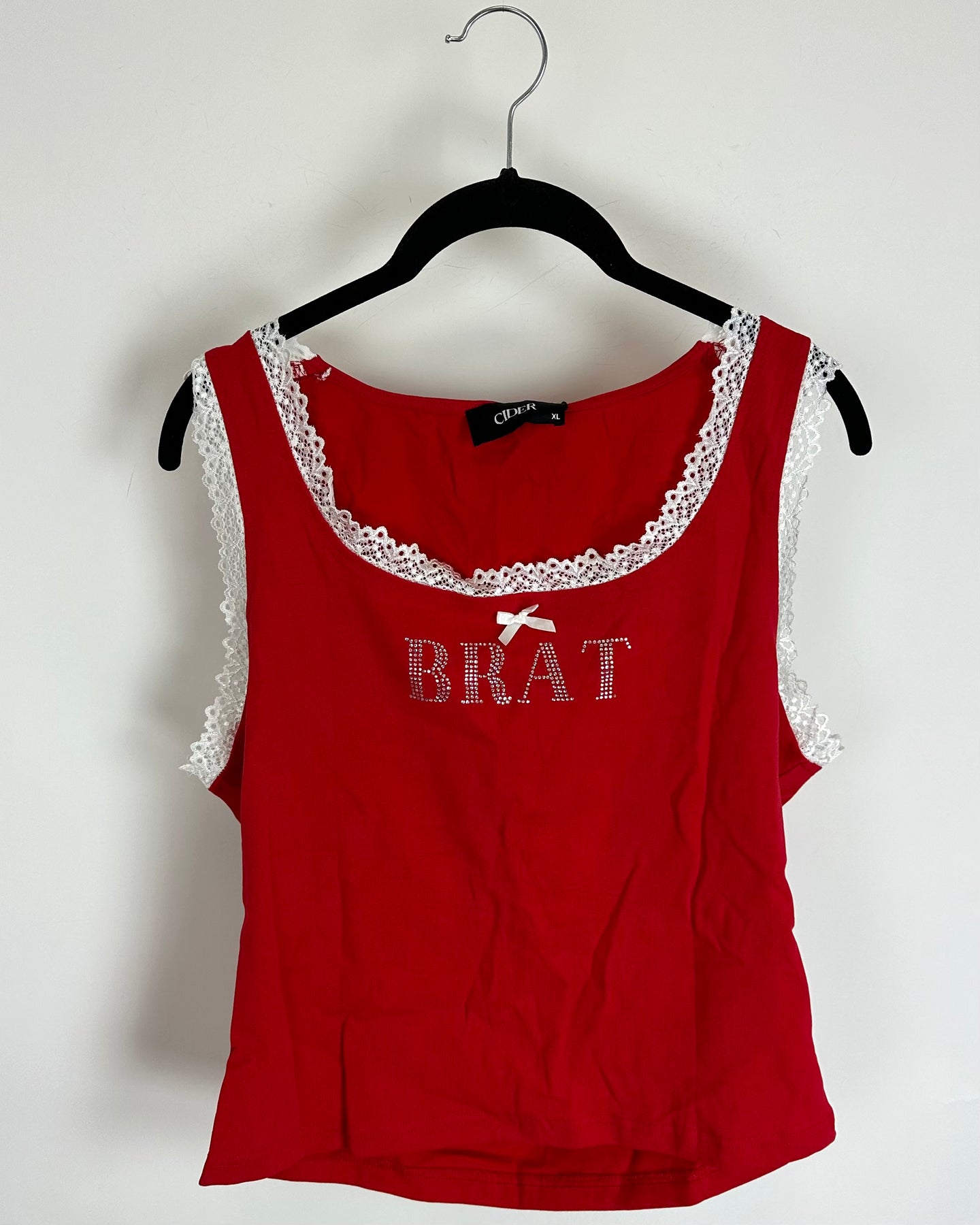 Cider red tank top, soft stretch knit material with sleeveless design, scooped neckline and white lace trim along collar and shoulders, with white satin bow and silver rhinestoned "BRAT" text front designs