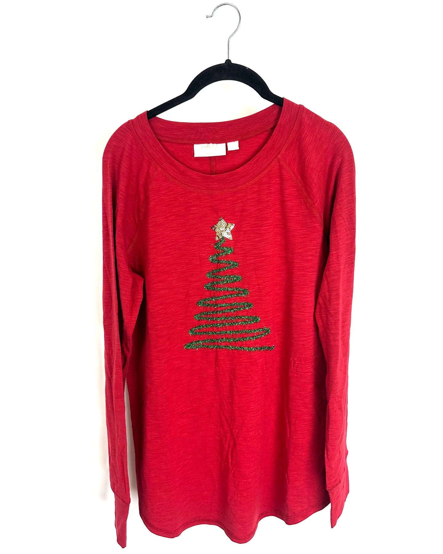 Kim Gravel red long sleeve with ornamental tree out of tinsel, and sequin design, very lightweight, round neckline, thin, soft, very cozy, with thumb hold opening on the cuffs
