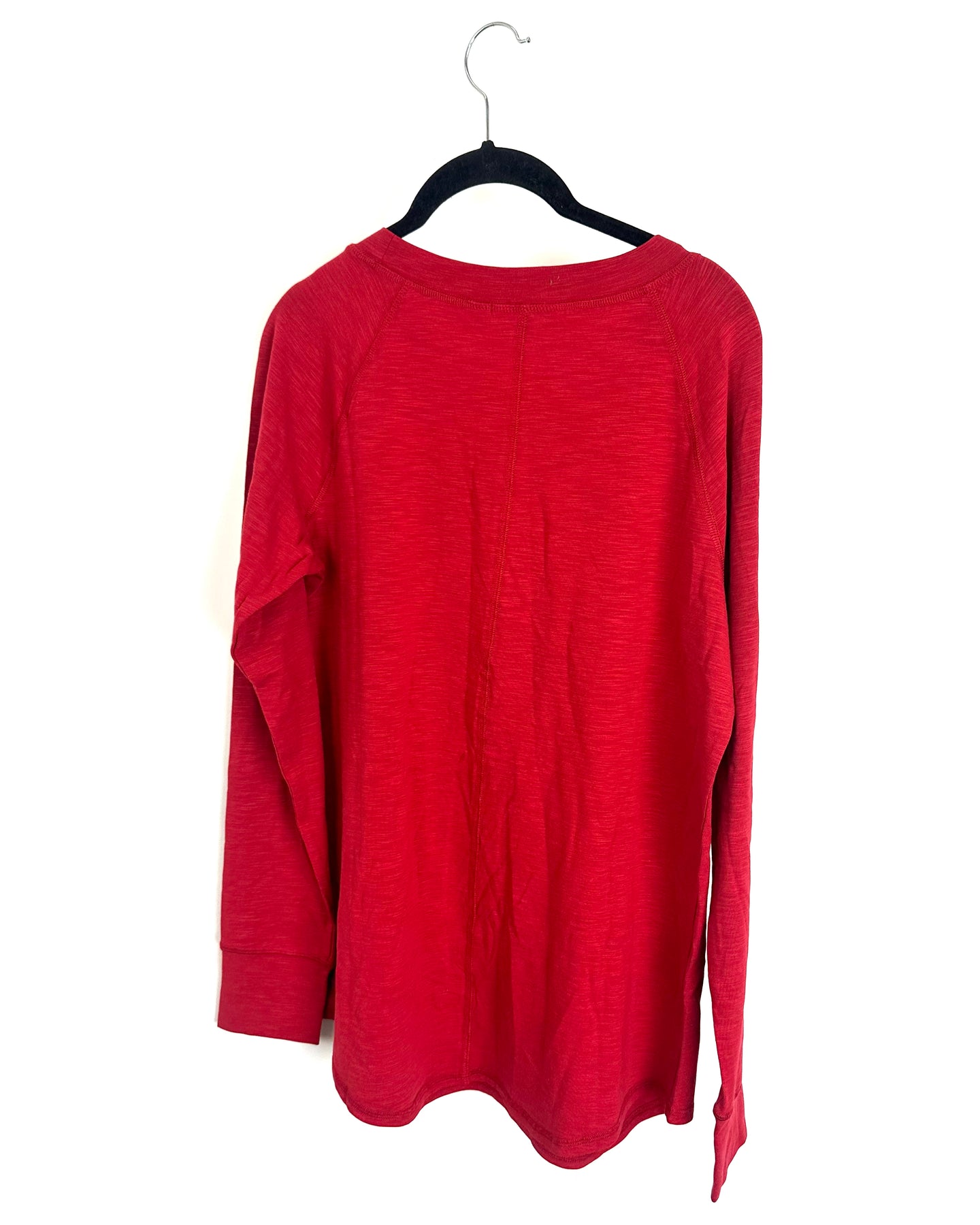 Kim Gravel red crewneck sweater featuring a cheerful green and yellow “Merry” design across the front, with long sleeves and finished with ribbed hems along the neckline, cuffs, and bottom