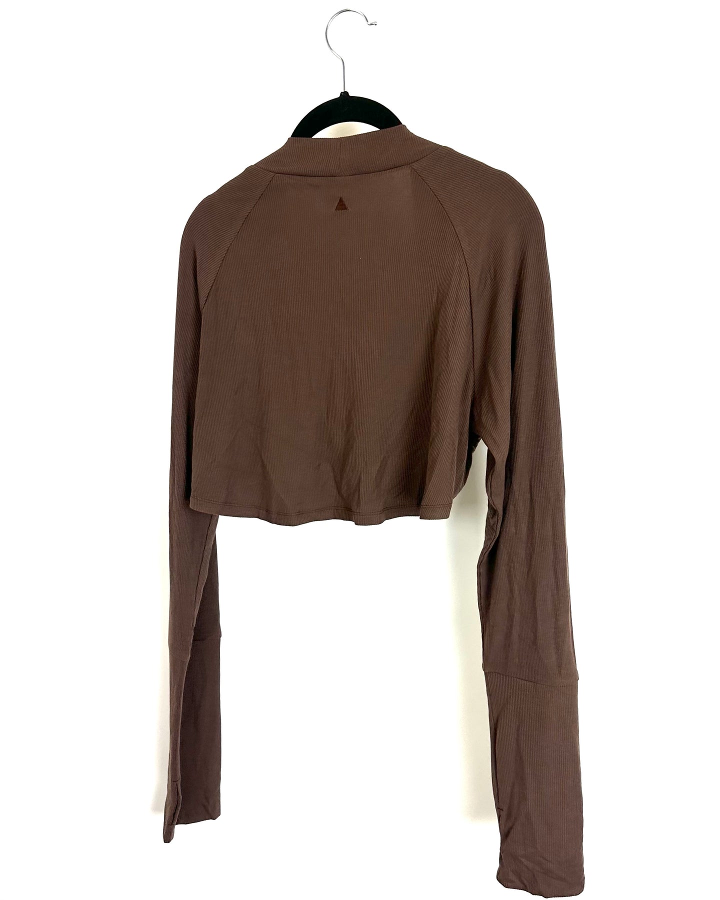 Vitality brown ribbed shrug in a cropped silhouette with long sleeves and open front