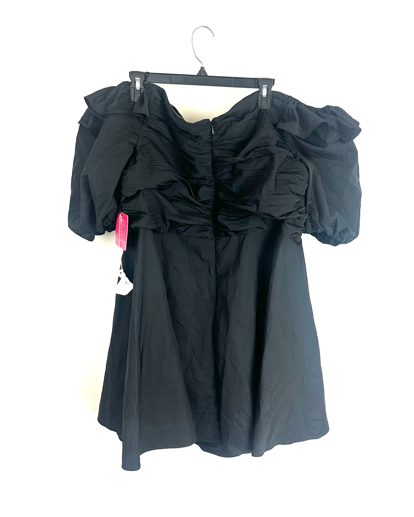 Prabal Gurung by JC Penny black off the shoulder dress with short sleeves, a lightweight material, a zippered back for closure and ruffle detail on the sleeves