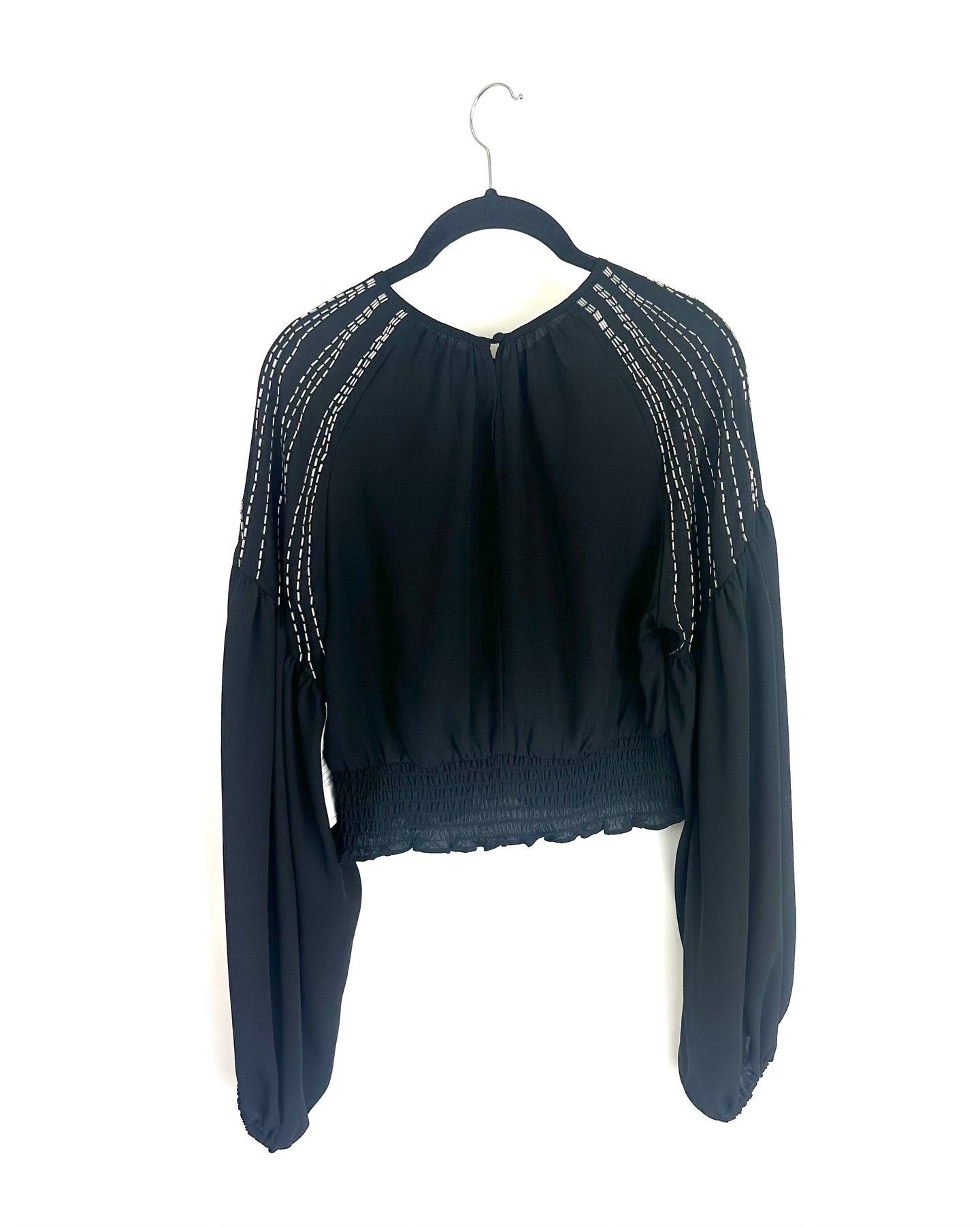 Black lightweight crop top with rhinestone details on each shoulder, button closure in the back and a sinched bottom