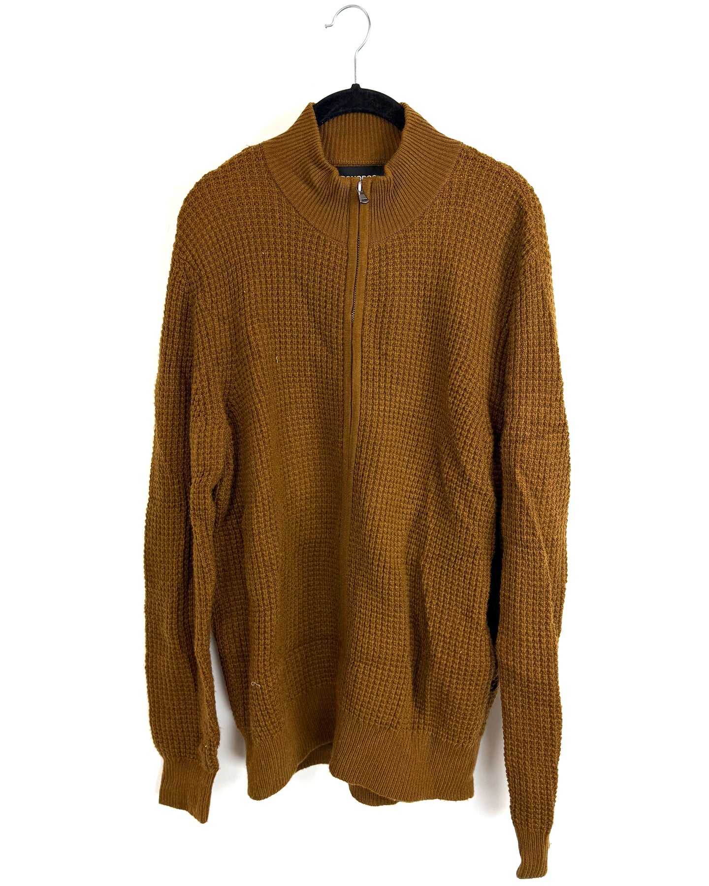 Bonobos unisex brown knit jacket with long sleeves that can be cuffed or uncuffed and mock neckline with full zipper front in a lightweight knit fabric