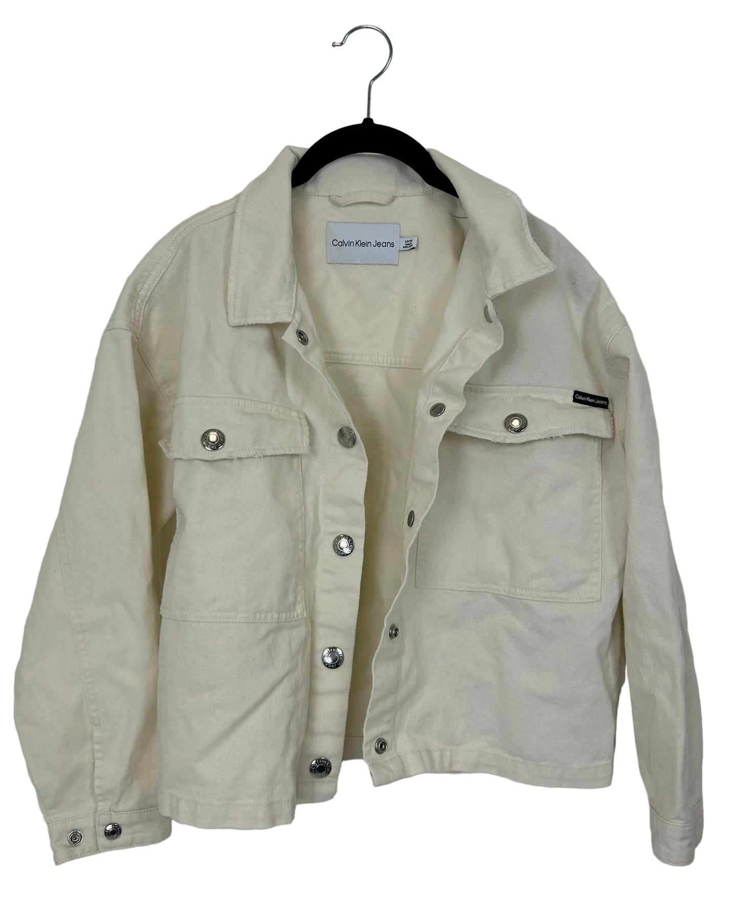 Calvin Klein cream denim cropped jacket with a center front button closure, two chest pockets and a collared neckline.