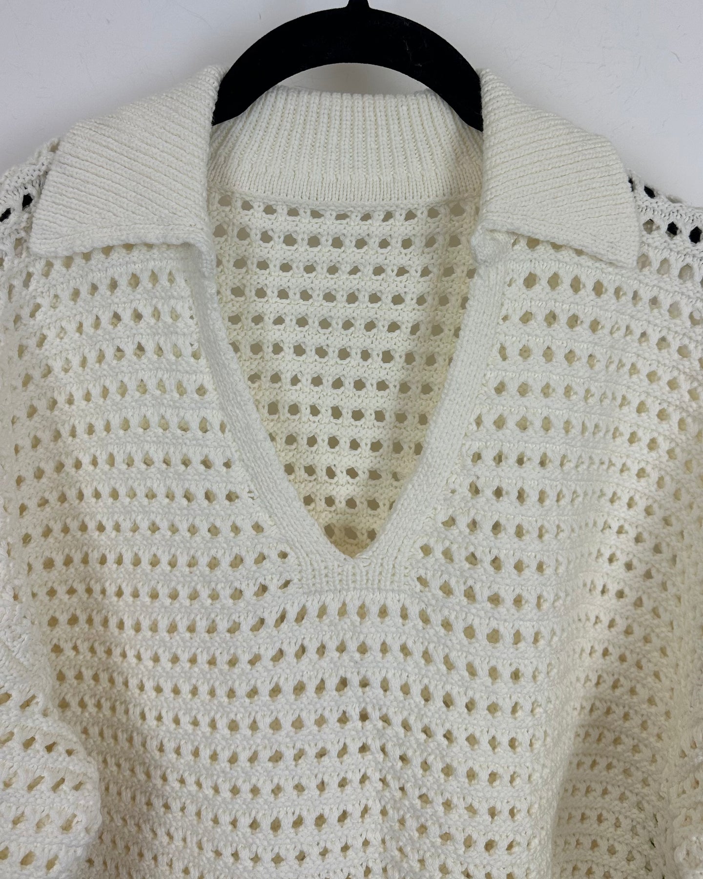 Reunited cream crochet knit sweater in an open and textured knit and boxy silhouette with a v-neckline, collar, long sleeves and abstract crochet detail on bottom