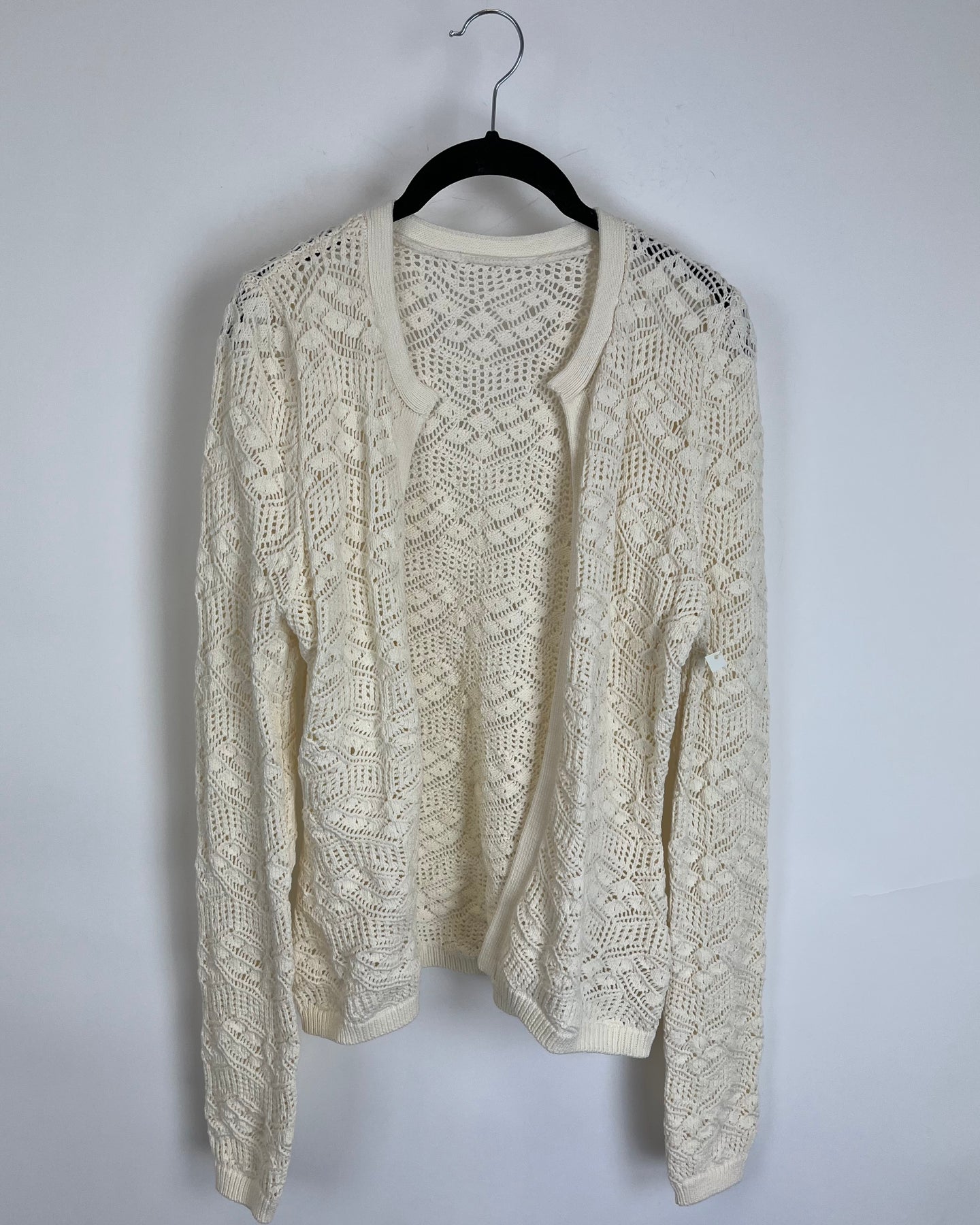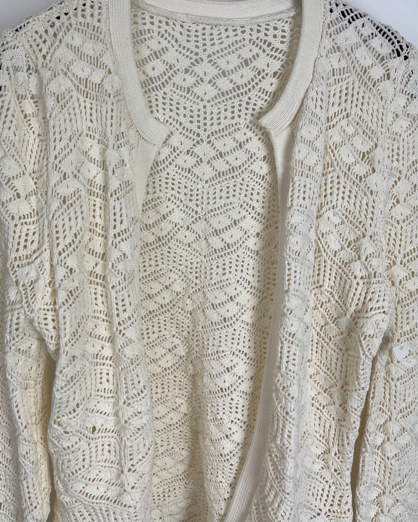 Reunited cream cardigan open-knit design with subtle geometric patterns, with ribbed trim along the neckline, cuffs, and hem
