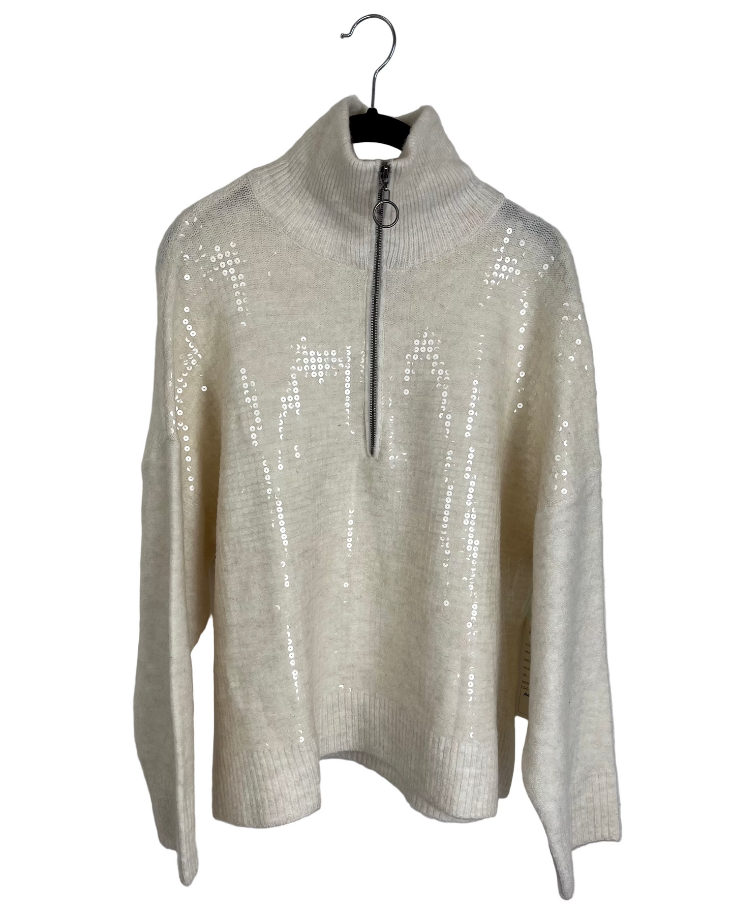 Reunited cream, quarter zip, sequin detail on frontside , long sleeved, mock neck, pull-on sweater